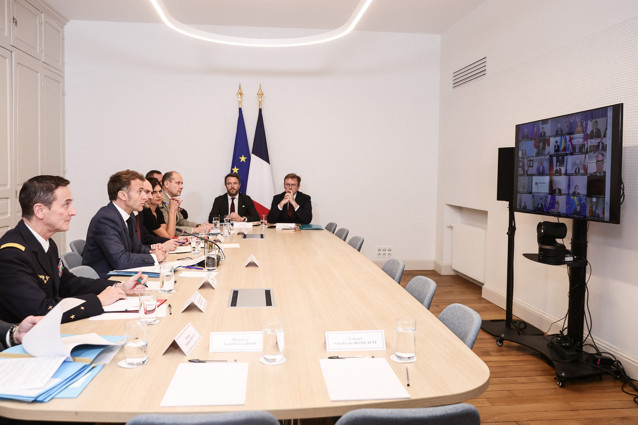 25日、パリでウクライナを支援する「有志連合」のオンライン会合に参加するマクロン仏大統領(左から2人目)。