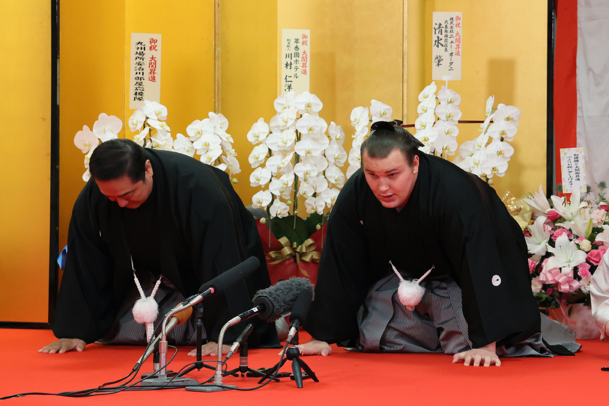 日本相撲協会は26日、福岡国際センターで大相撲初場所の番付編成会議と臨時理事会を開き、東関脇の安青錦(21)の大関昇進を満場一致で決めた。写真は大関昇進の伝達式で口上を述べる安青錦。左は安治川親方。