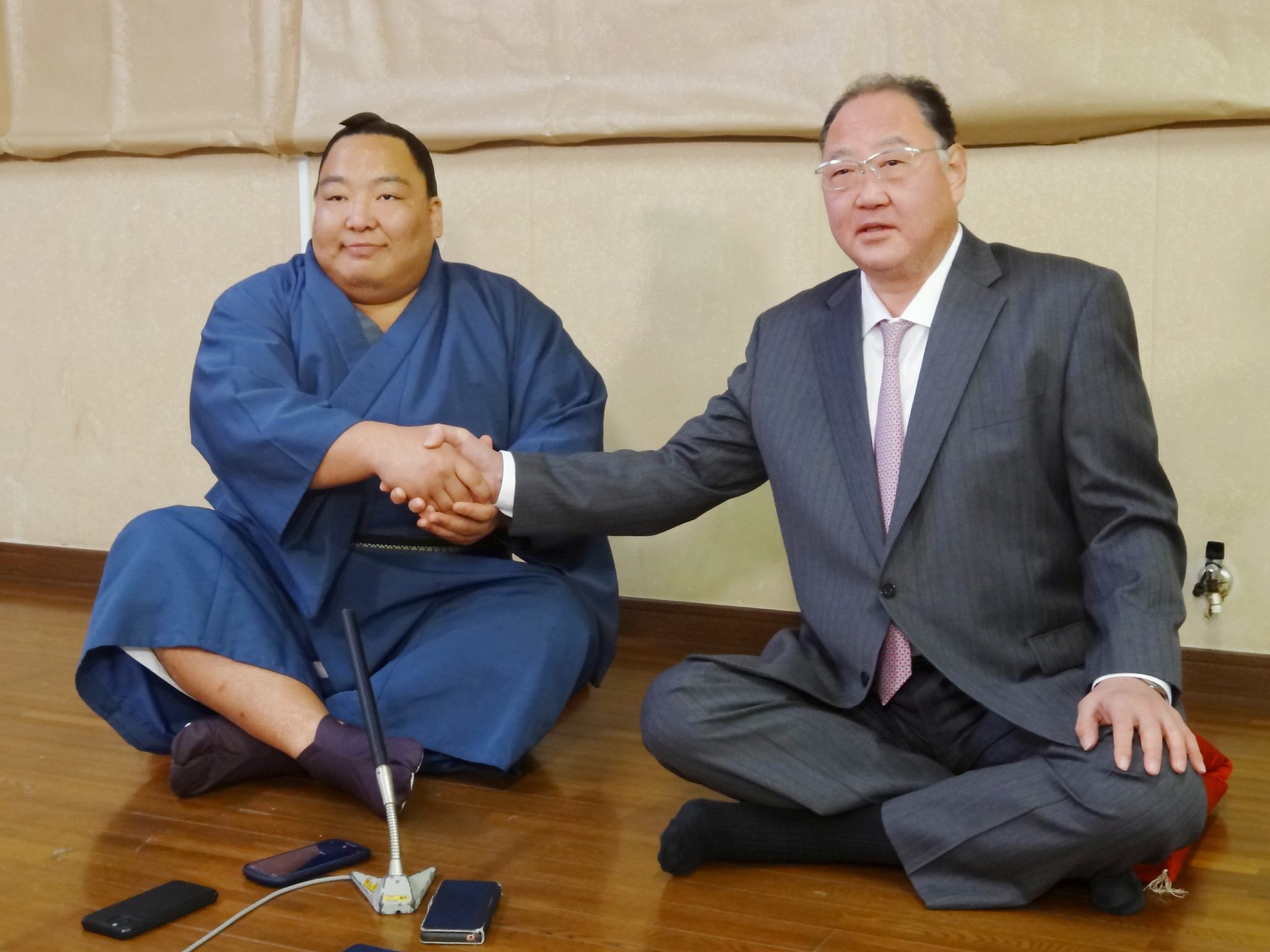 大相撲初場所の番付編成会議が26日に開かれ、新十両昇進が決まった出羽ノ龍(左)が福岡県の出羽海部屋宿舎で記者会見し、「少しずつ力がついて上がることができた」と喜びをかみしめた。右は師匠の出羽海親方。