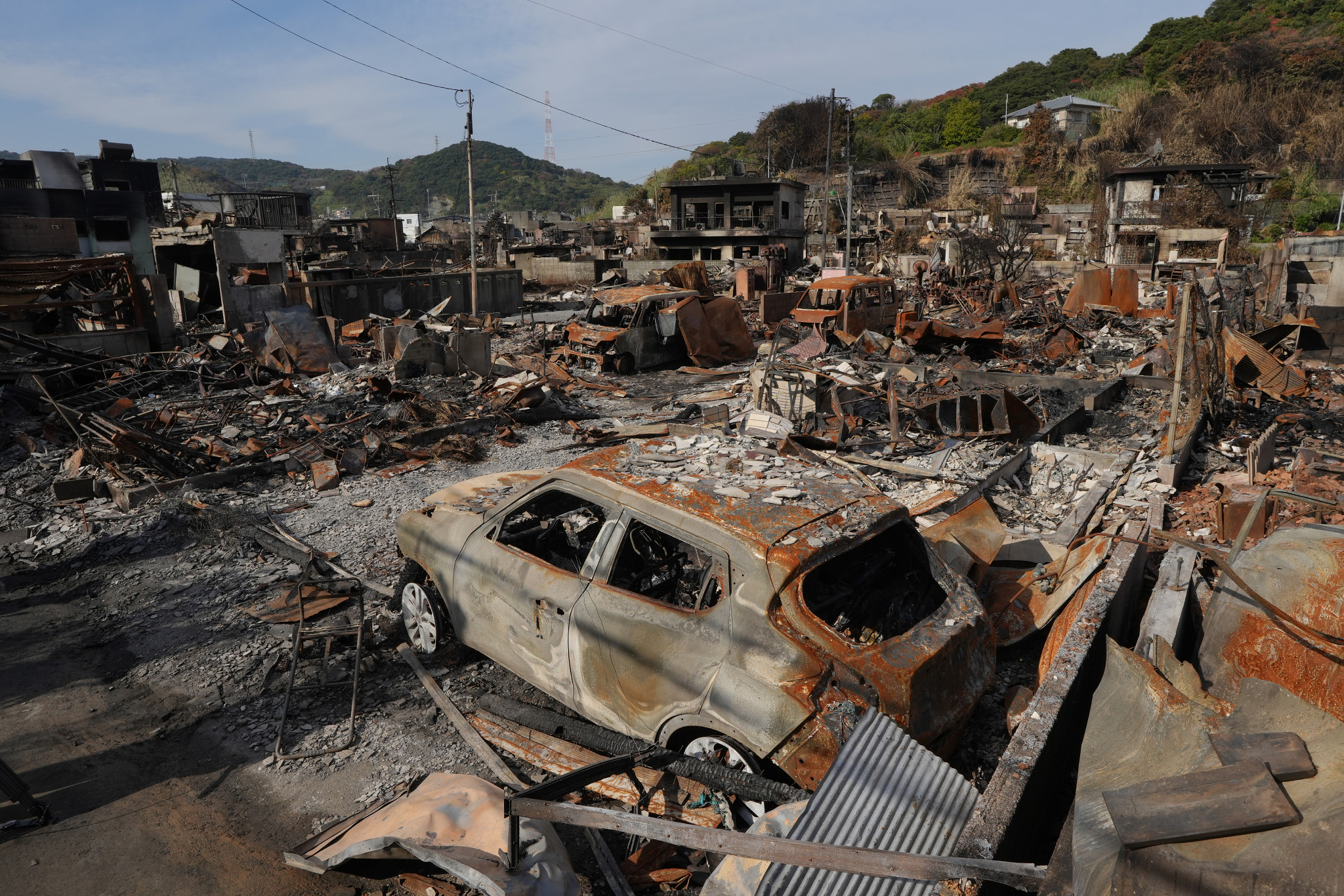 大分市佐賀関で発生した大規模火災で、市は27日、立ち入り規制区域内の一部を報道陣に公開した。現場には焦げたにおいが残り、焼けた車や鉄骨がむき出しになった建物、無数のがれきが炎の激しさを物語っていた。