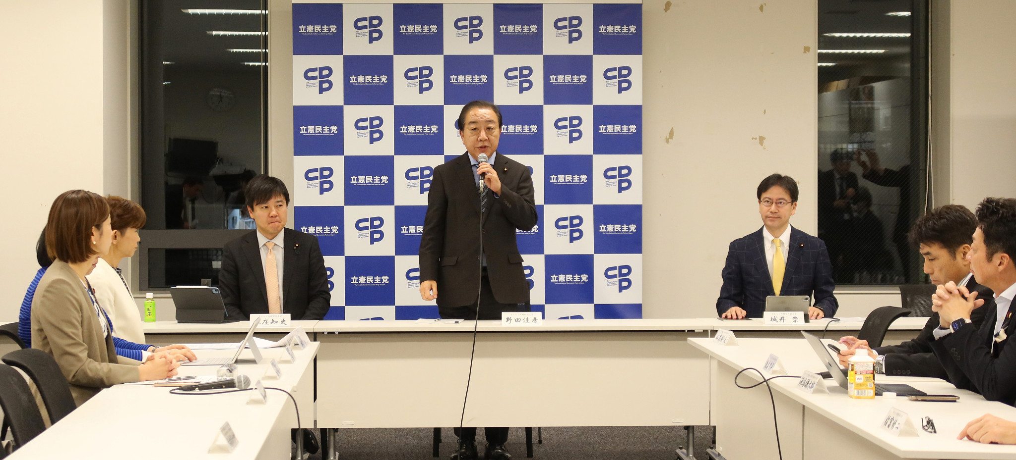 立憲民主党の「次の内閣」であいさつする野田佳彦代表(中央)=27日午後、国会内