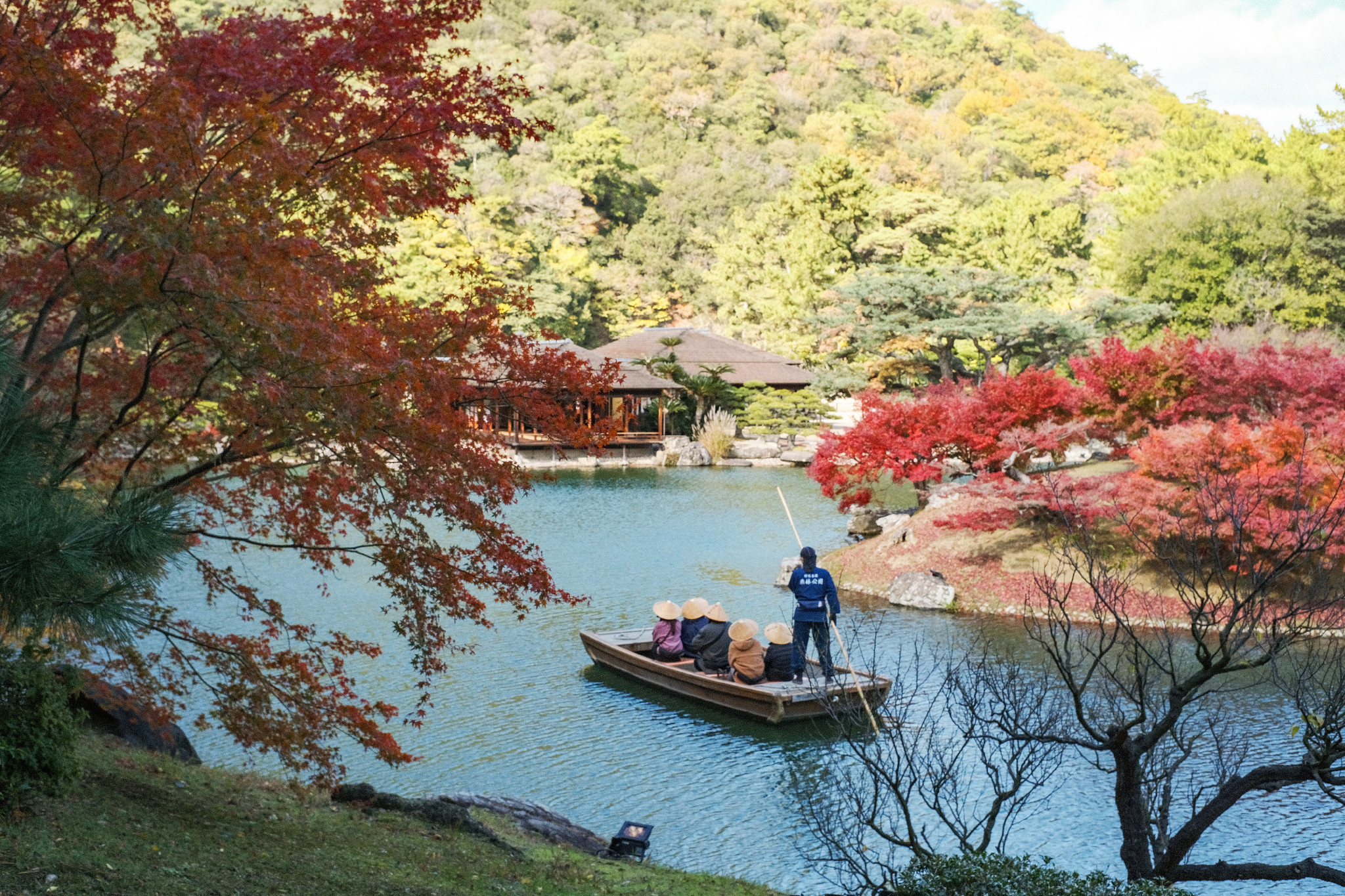 栗林公園(香川県高松市)の紅葉が見頃を迎えている。園内計270本のもみじが鮮やかな赤色に染まり、多くの観光客で賑わっている。30日までライトアップも行われる=28日