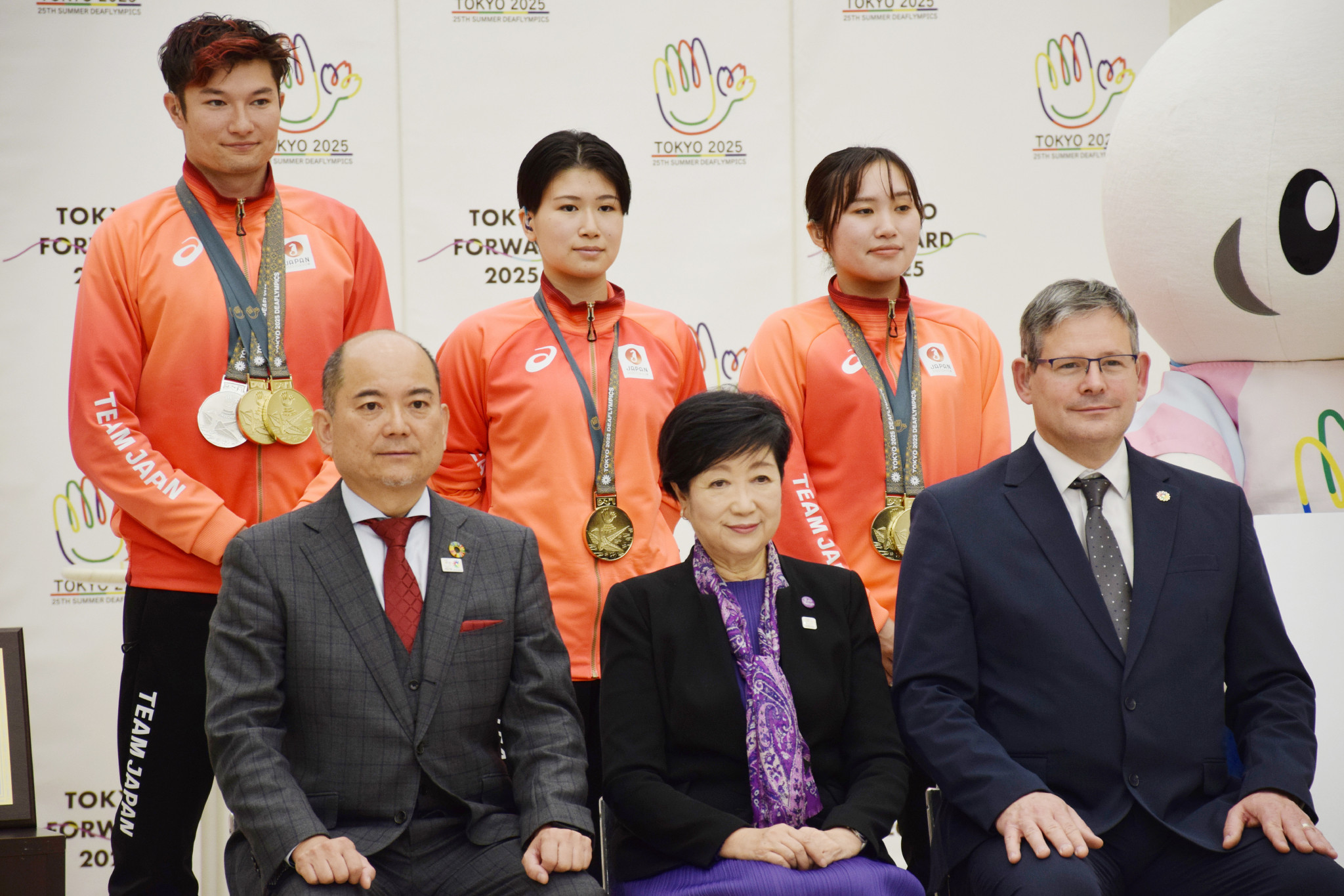 デフリンピック東京大会を終えて小池百合子都知事(前列中央)と面会し、撮影に応じる国際ろう者スポーツ委員会のアダム・コーサ会長(前列右)ら。後列左はデフ陸上の山田真樹=28日、東京都庁