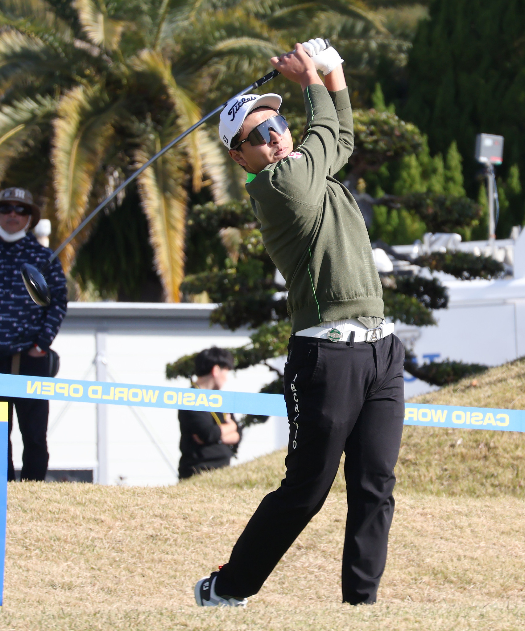 カシオ・ワールドオープン第2日。ティーショットを放つ鈴木晃祐。65で回り、通算14アンダーに伸ばして首位に立った=28日、高知・Kochi黒潮CC