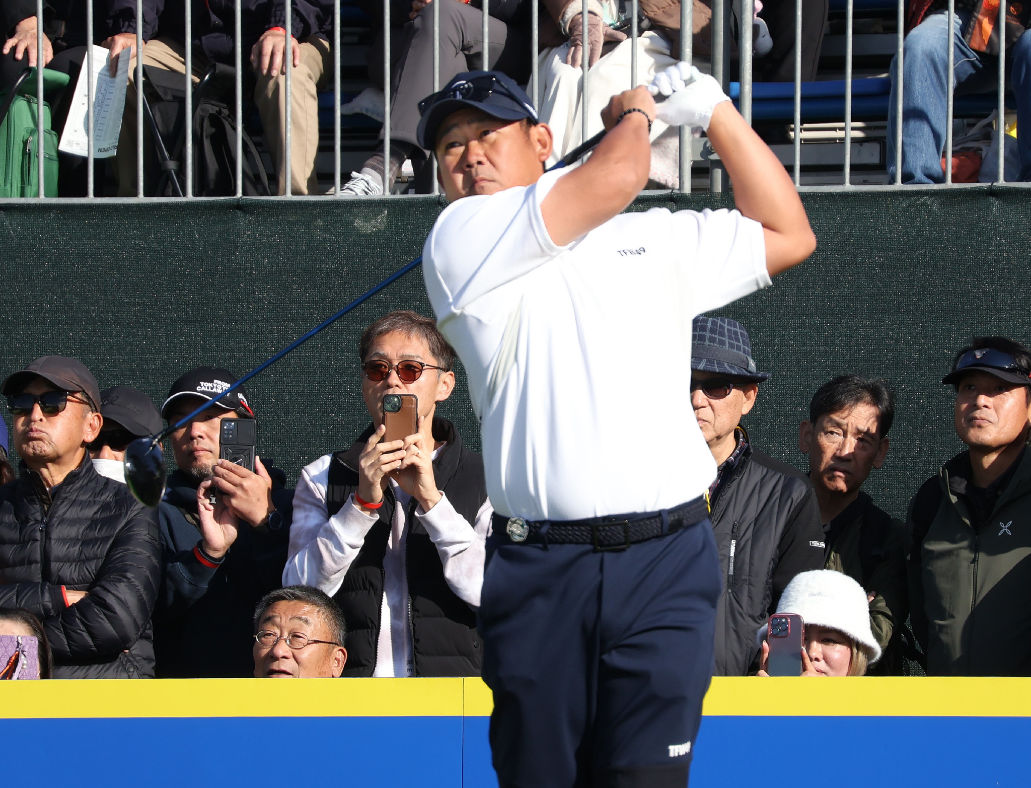 カシオ・ワールドオープン第2日。ティーショットを打つ松坂大輔さん=28日、高知・Kochi黒潮CC