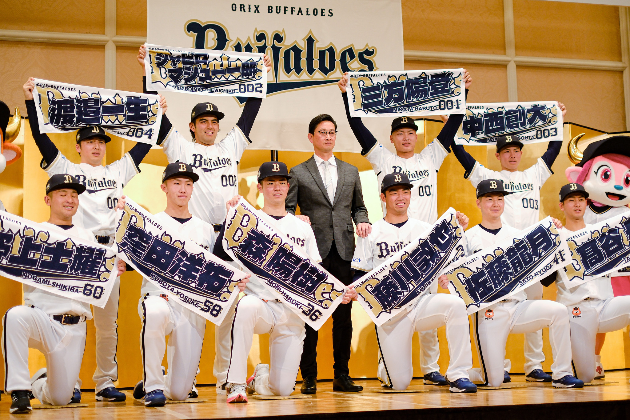 オリックスは28日、大阪市内で新人選手の入団発表を行った。写真は撮影に臨む岸田護監督(中央)、ドラフト1位の藤川敦也投手(前列右から3人目)ら。
