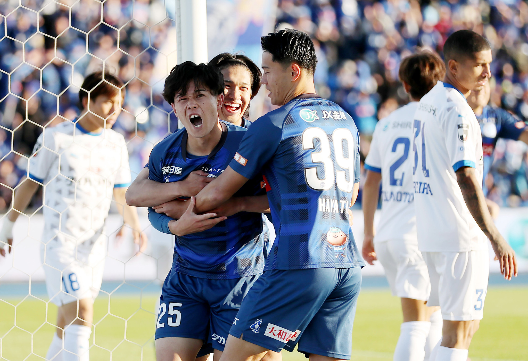 大分戦の後半に先制ゴールを決め、喜ぶ水戸の多田(手前左)=29日、Ksスタ