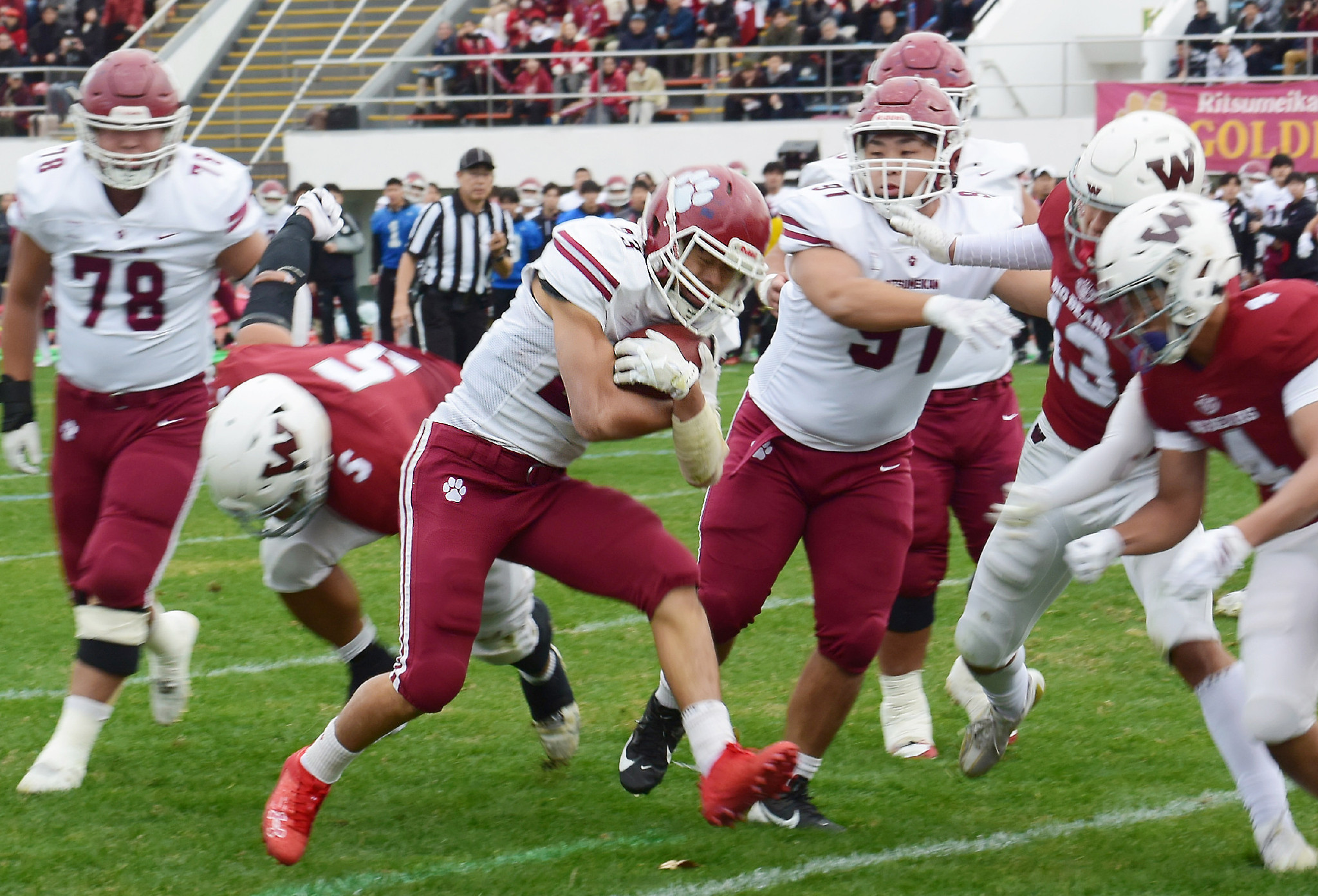 準決勝でタッチダウンを挙げる立命大の蓑部(中央)=29日、東京・スピアーズえどりくフィールド
