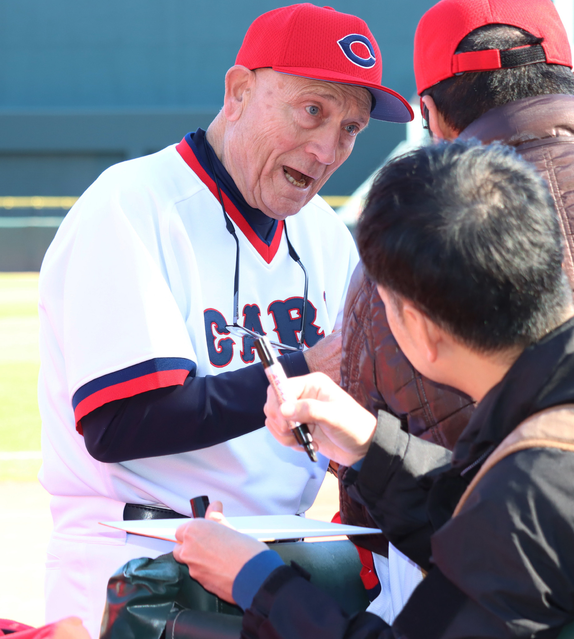 広島OB戦のイベントを前に、サインに応じるゲイル・ホプキンスさん=29日、マツダスタジアム