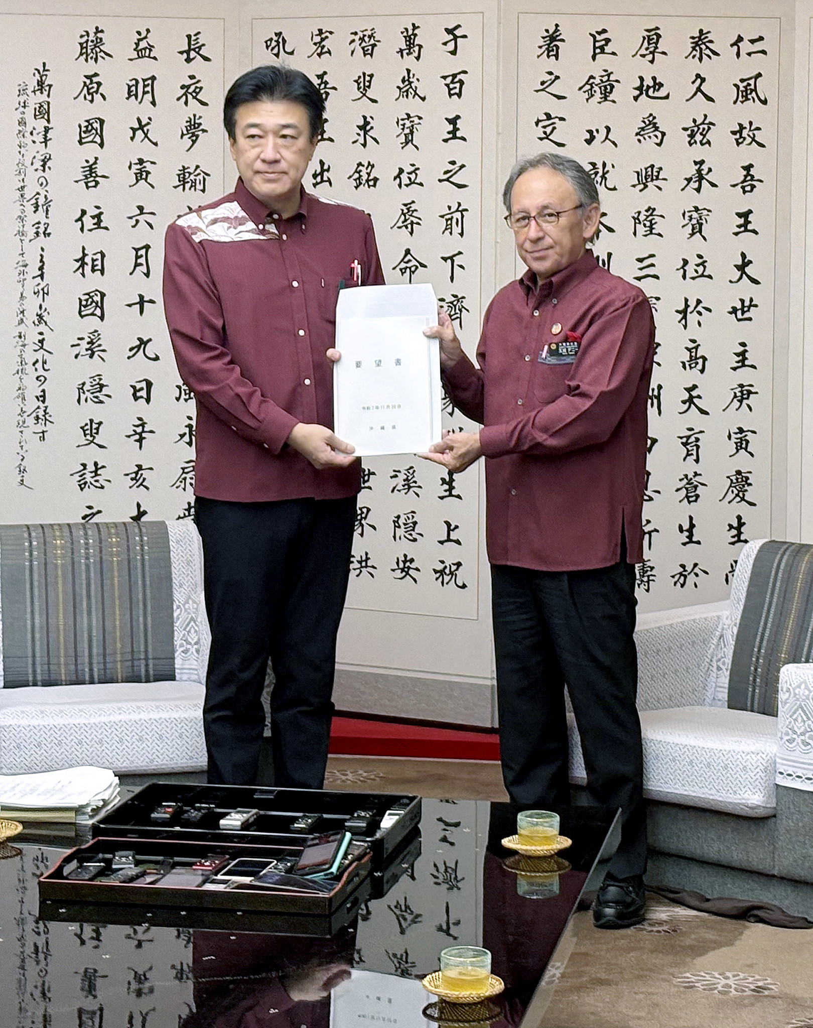 沖縄県の玉城デニー知事(右)から要望書を受け取る木原稔官房長官=30日午後、那覇市