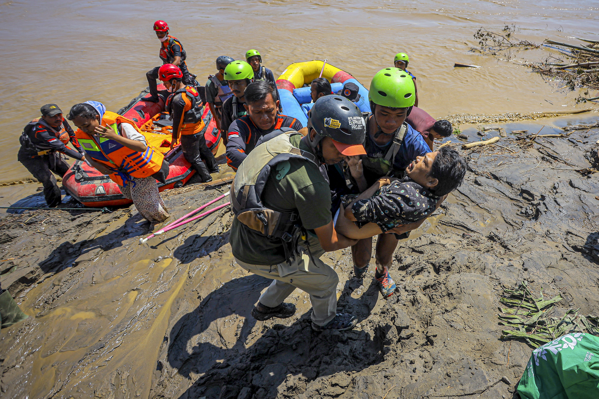 インドネシア国家災害対策庁によると、同国西部スマトラ島で24日から続いた豪雨による死者数が442人となった。依然として数百人が行方不明となっている。写真は被災した住民を救出する救急隊員=29日【AFP時事】