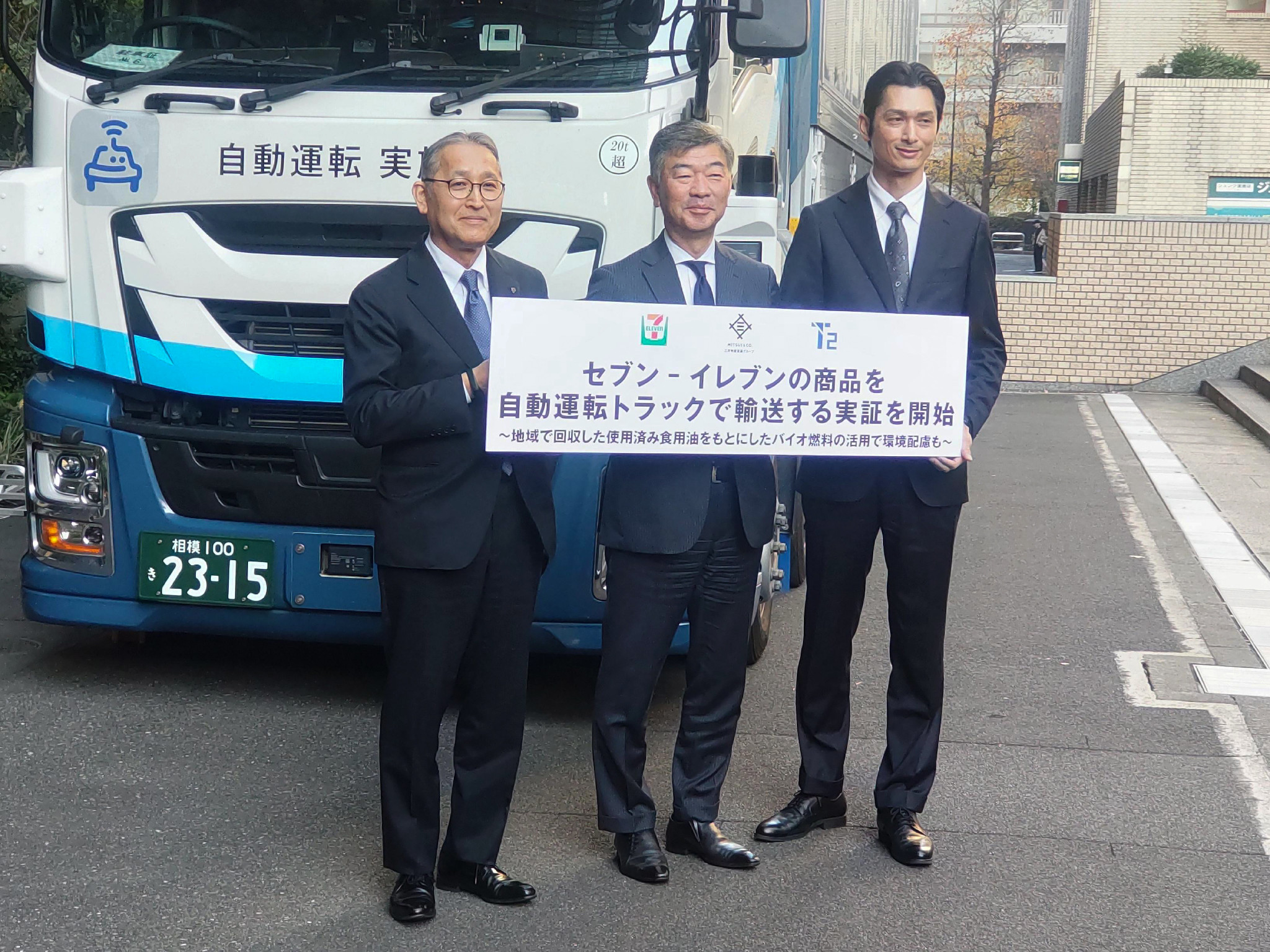 セブン―イレブン・ジャパンは1日、自動運転トラックで商品を輸送する実証実験を始めると発表した。自動運転システムを開発するT2、三井物産物流グループと共同で実施する=東京都千代田区