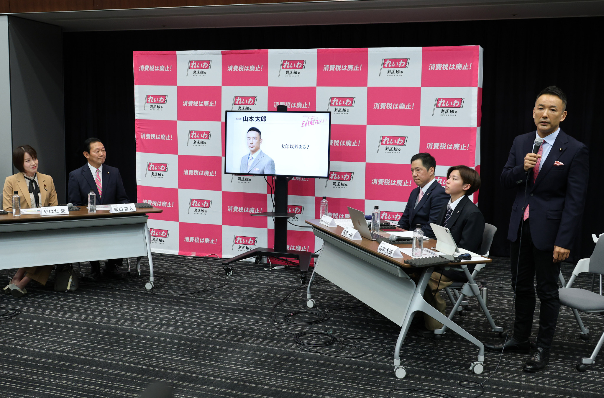 れいわ新選組の任期満了に伴う代表選が1日、告示された。現職の山本太郎氏、阪口直人衆院議員、八幡愛衆院議員ら5氏が立候補を届け出た。写真は、記者会見する山本代表(右端)ら立候補者=同日午後、国会内