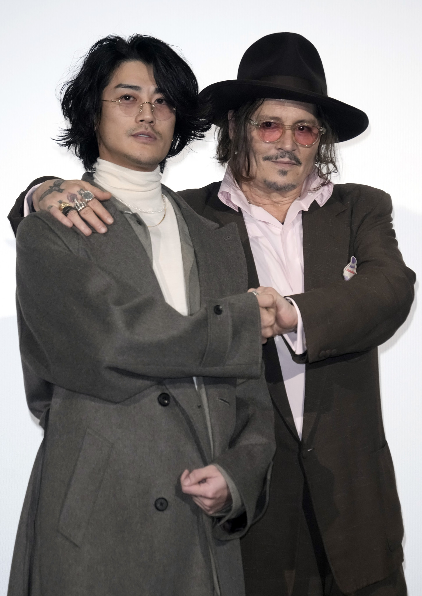 ジョニー・デップさんが約30年ぶりに監督を務めた映画「モディリアーニ!」のジャパンプレミアに出席。花束を贈呈した赤西仁さんとともにフォトコールに臨んだ。映画は来年1月に公開=2日、都内【時事通信フォト】