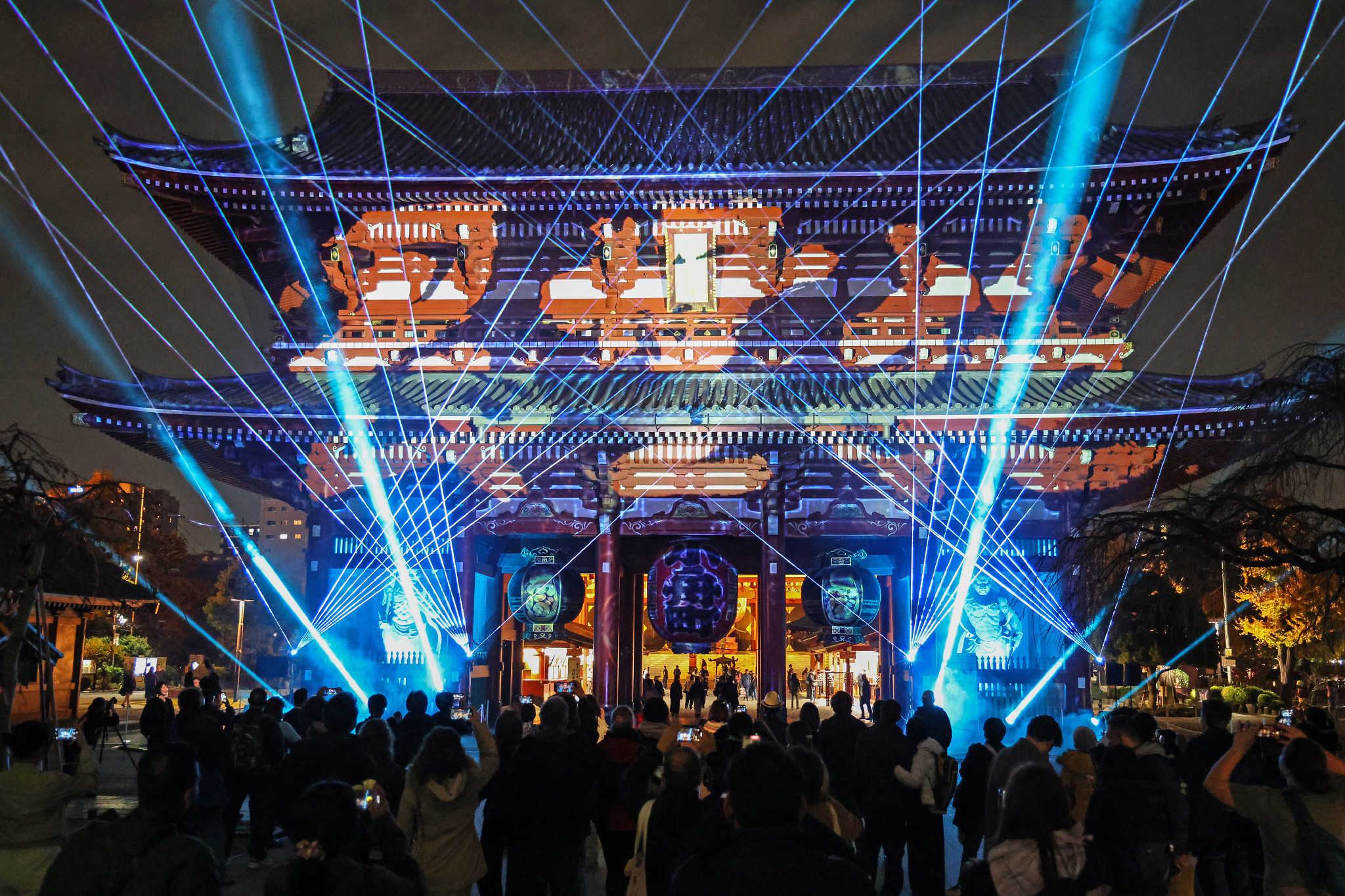 2025」のプレスイベントで浅草寺の宝蔵門にプロジェクションマッピング映像が投影された=2日午後、東京都台東区