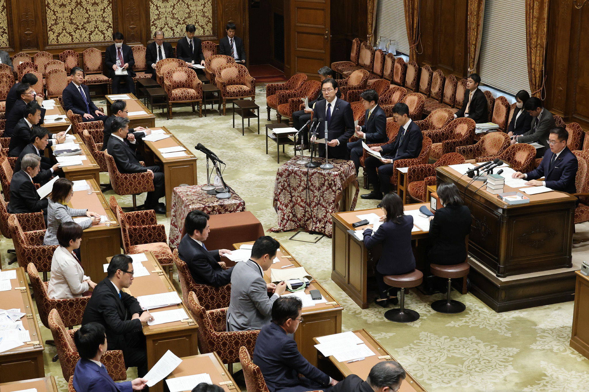 衆院政治改革特別委員会で企業・団体献金見直し法案の趣旨説明を行う自民党の勝目康氏(中央右)=3日午後、国会内