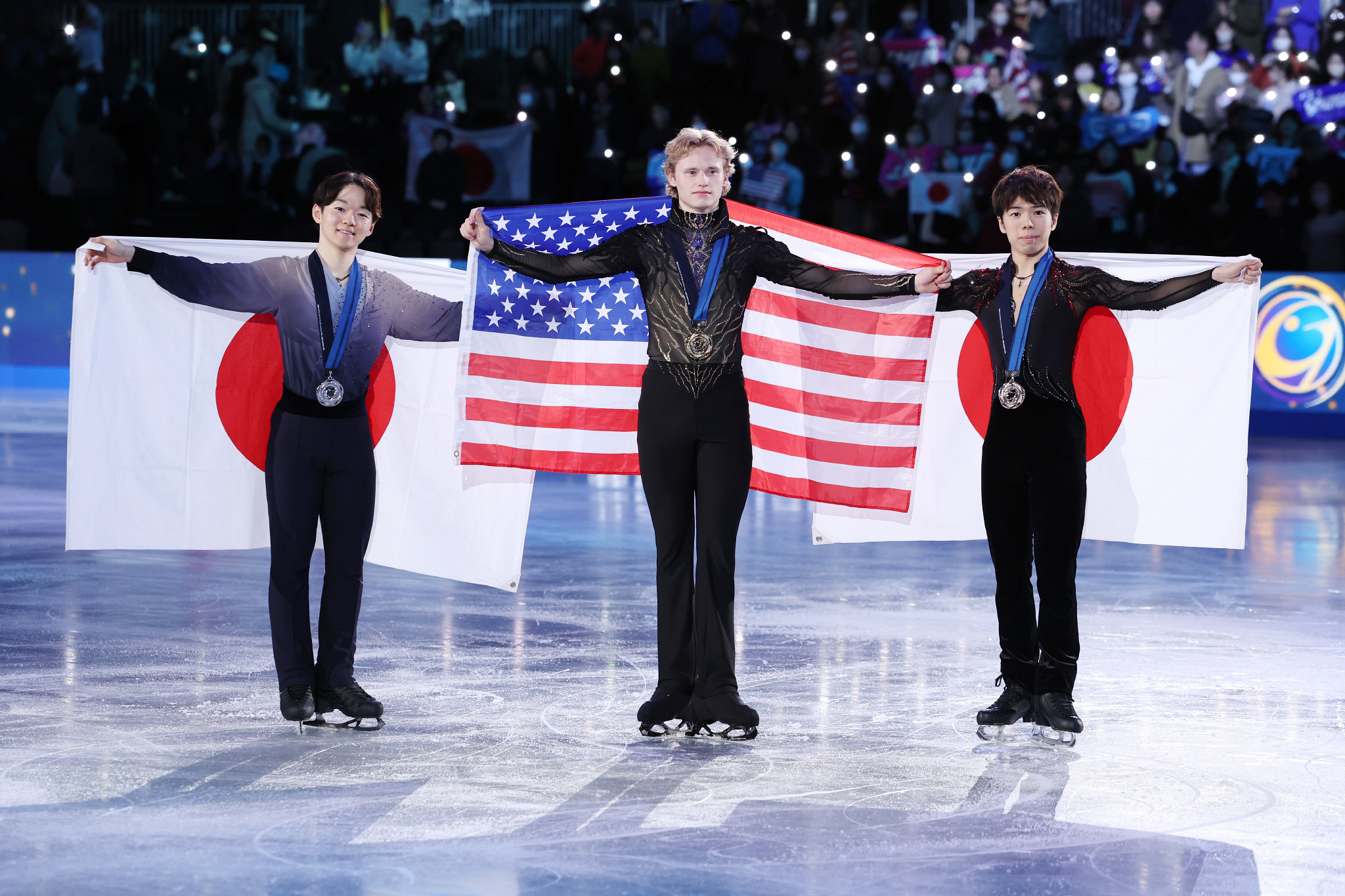 フィギュアスケートのグランプリ(GP)シリーズ成績上位6人(組)で争うファイナル最終日。男子の表彰で撮影に応じる(左から)2位の鍵山優真、優勝のマリニン、3位の佐藤駿=6日、愛知・IGアリーナ