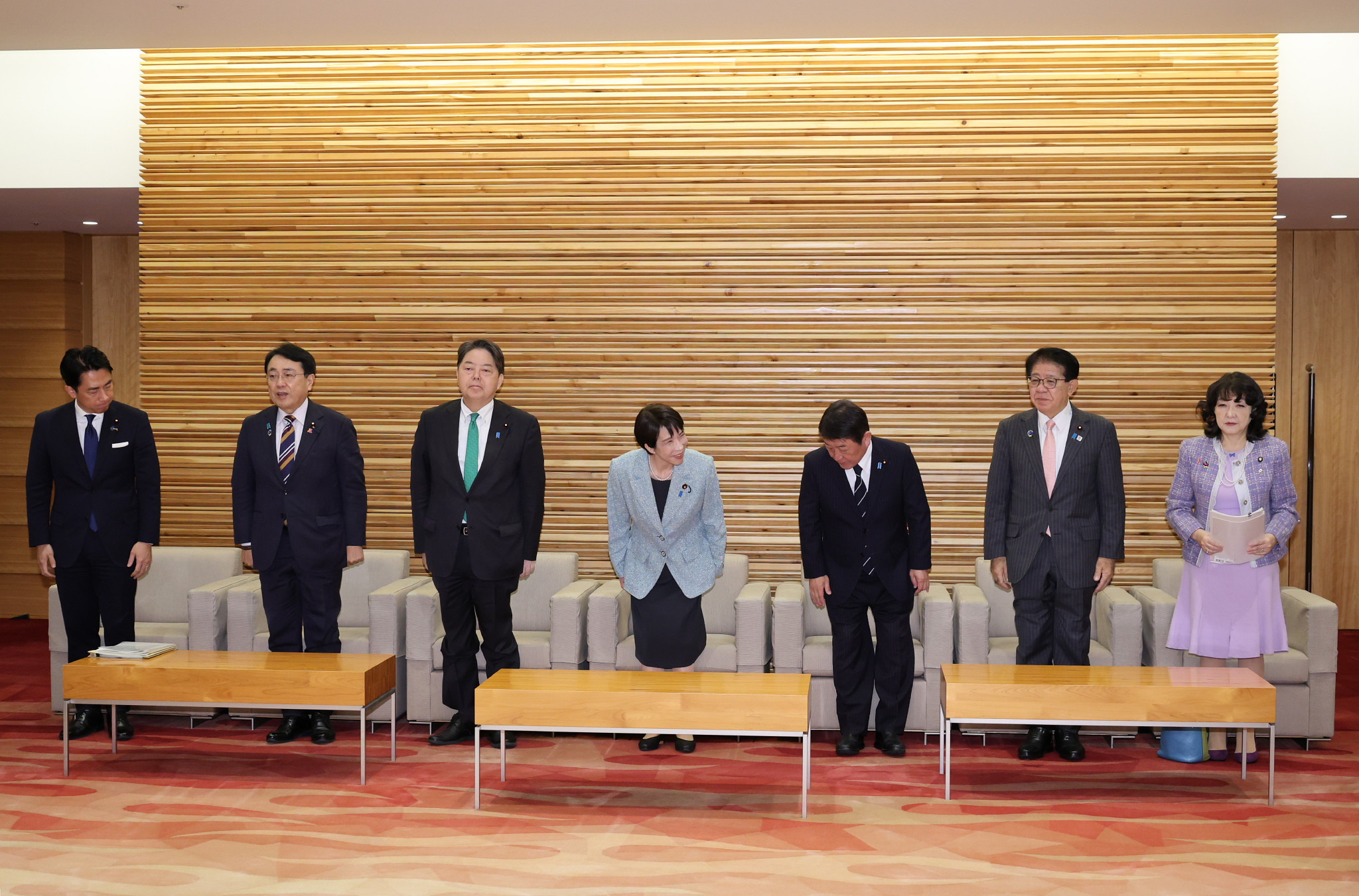 閣議に臨む高市早苗首相(中央)ら=8日午前、首相官邸