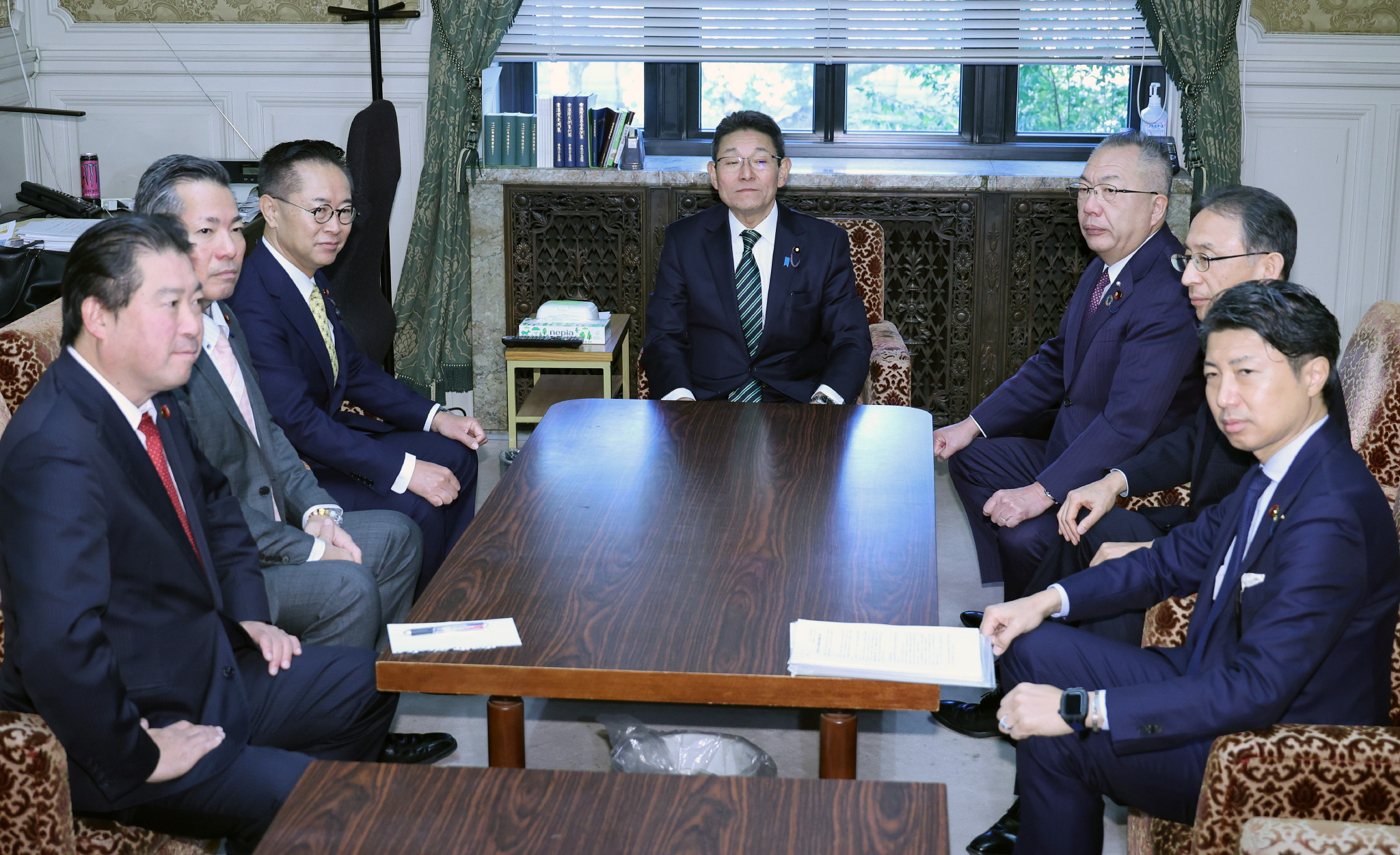 野党6党派は8日、国会内で国対委員長会談を開き、自民党と日本維新の会が提出した衆院議員定数削減法案に反対する立場を確認した。写真は会談に臨む立憲民主党の笠浩史国対委員長(中央)ら。