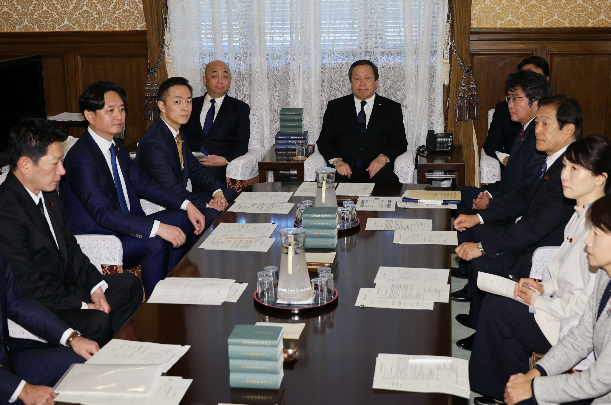 衆院議院運営委員会の理事会に臨む浜田靖一委員長(中央奥)ら=8日午前、国会内