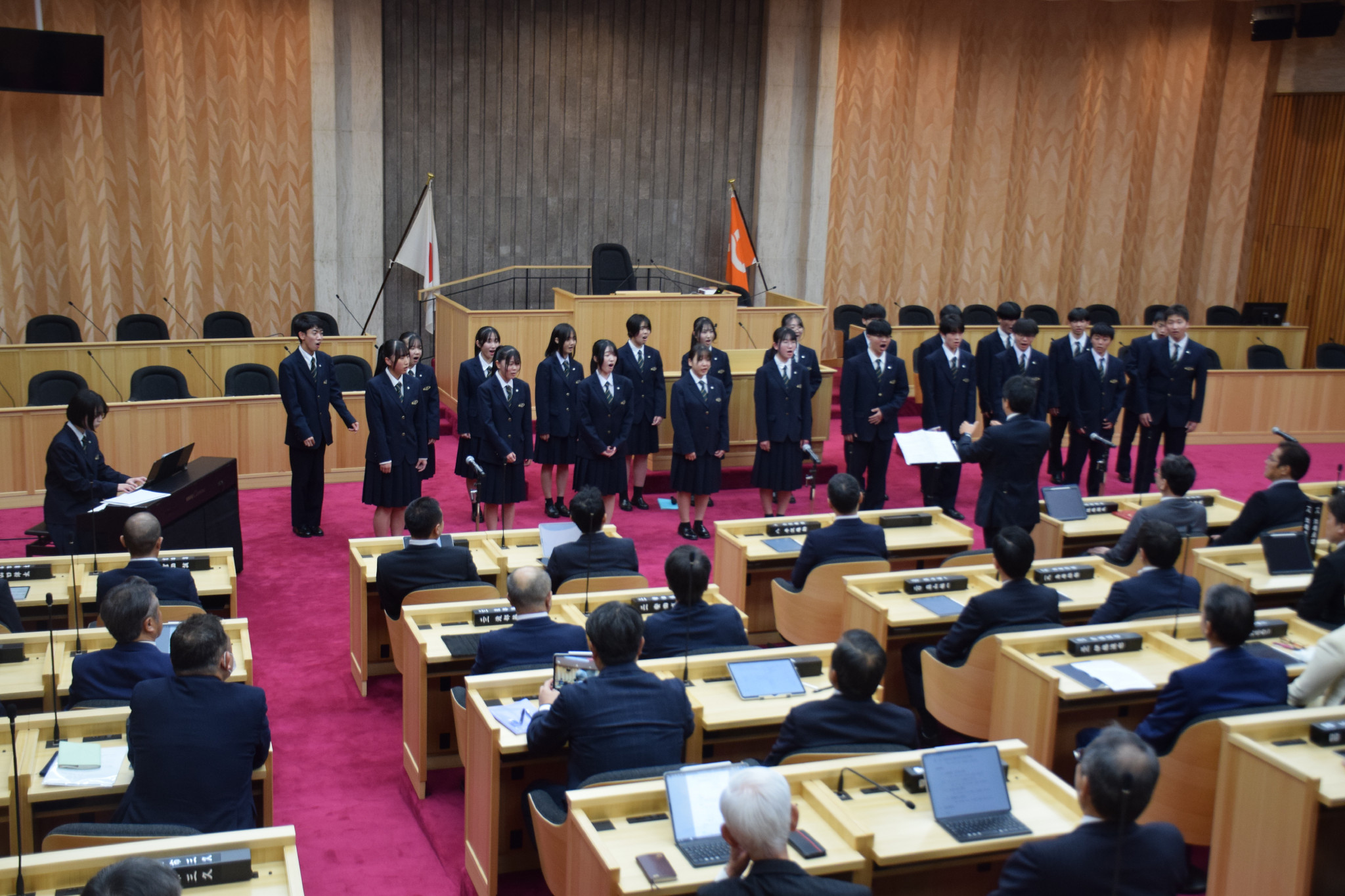 福島県議会は、完成した新議場で初めてとなる12月定例会の開会日に合わせて、議場開場記念行事を行った。県立橘高校の合唱部が本会議を見学した後、演奏を披露した=9日午後、福島市