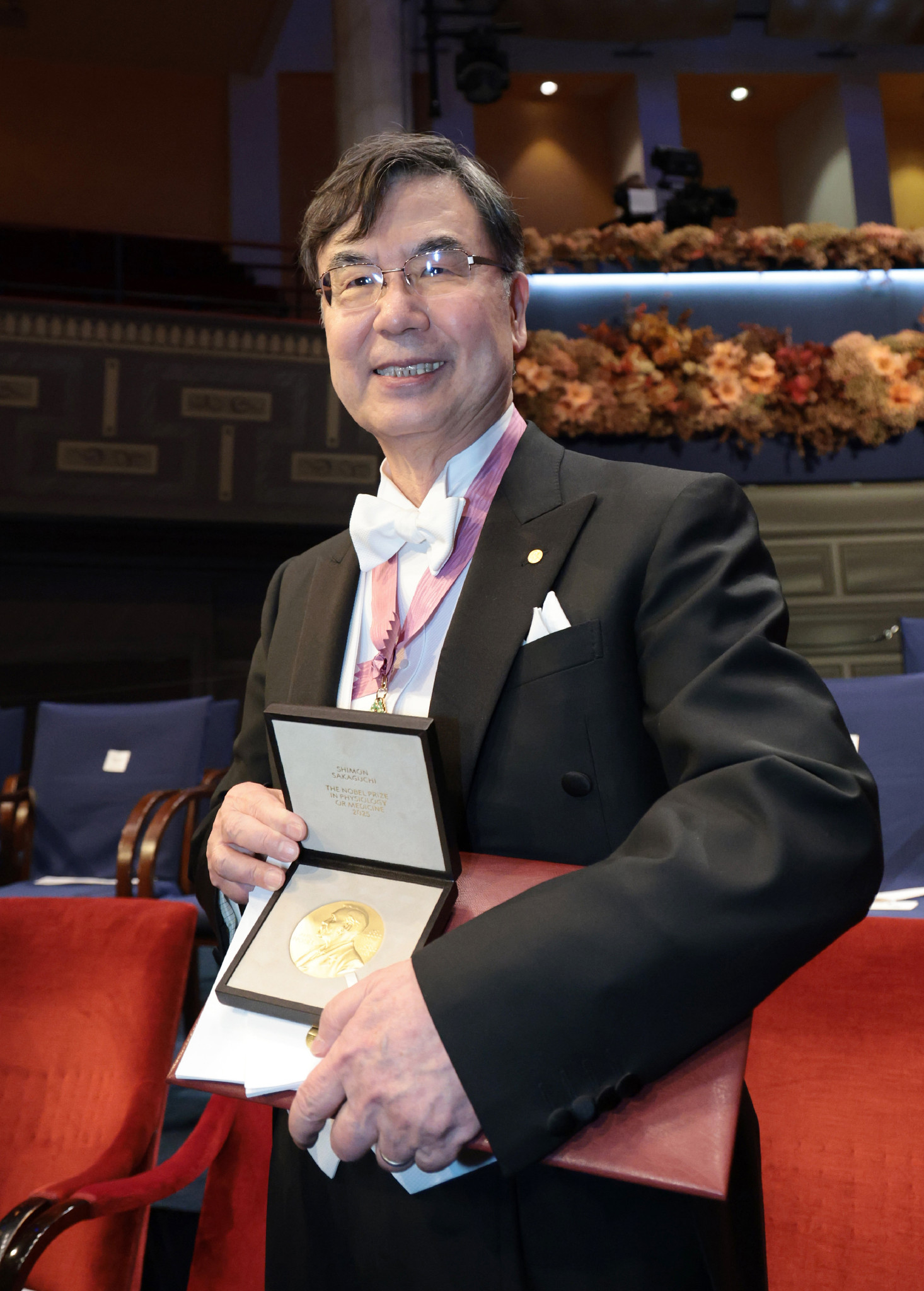 ノーベル賞授賞式を終え、メダルを手に記念撮影に応じる、生理学・医学賞を受賞した大阪大の坂口志文特任教授=10日、ストックホルム
