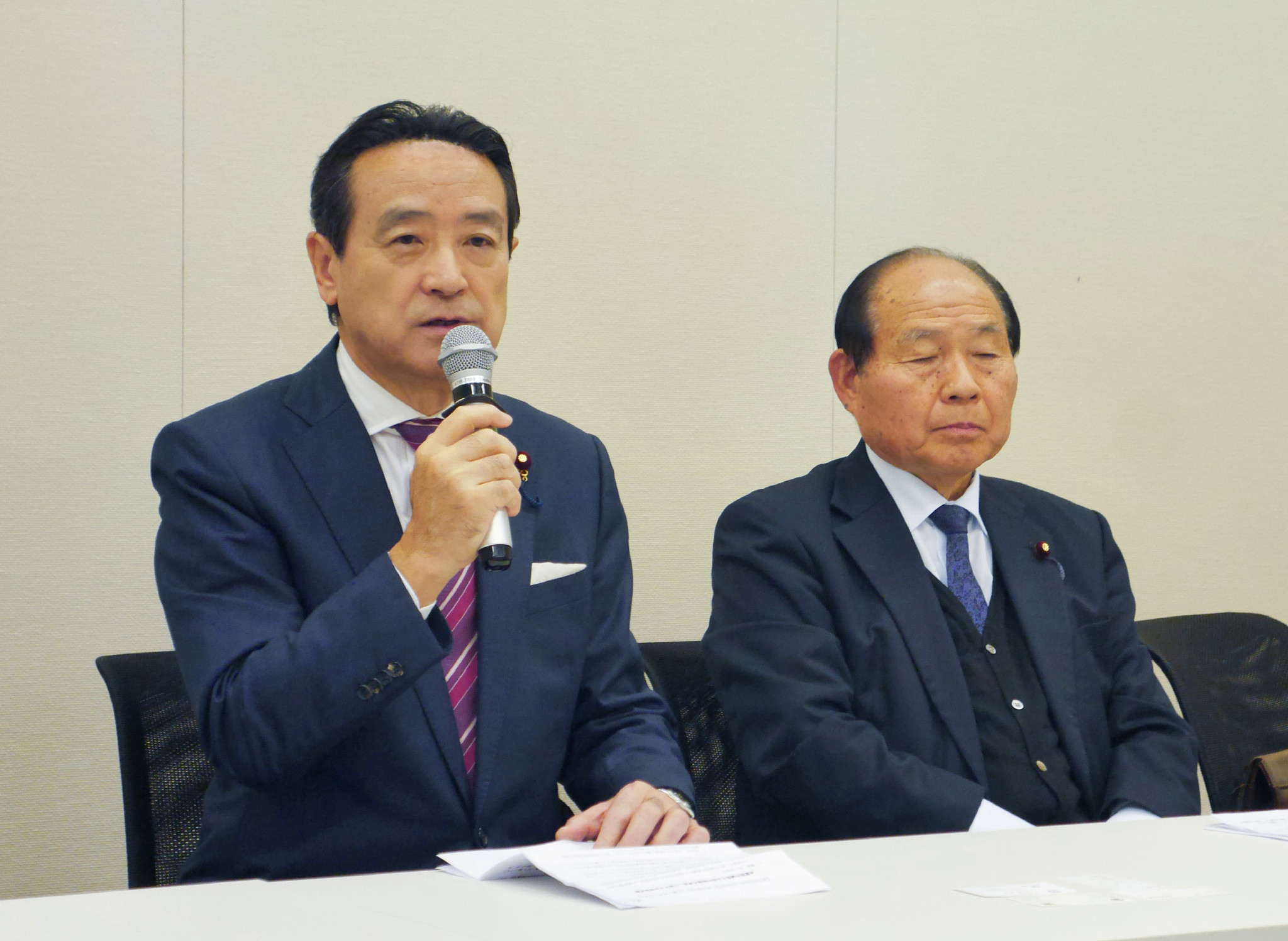 立憲民主党の有志議員による勉強会「不公平税制の抜本改革で消費減税の財源をつくる会」の会合後、記者団の取材に応じる江田憲司元代表代行(左)=11日午後、国会内