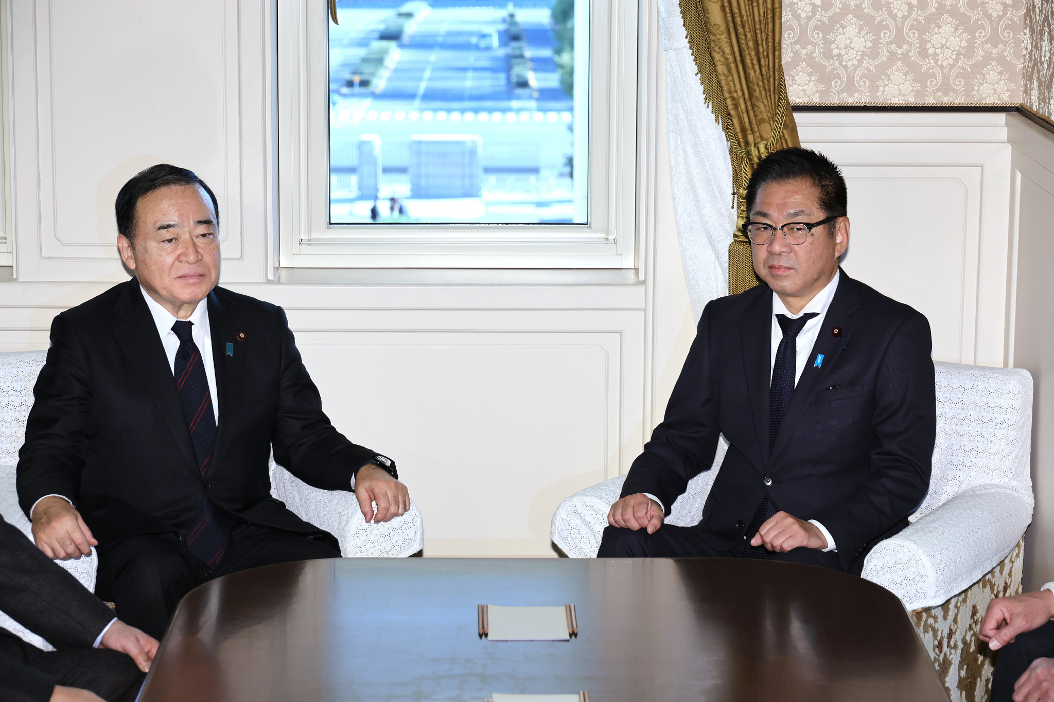 会談に臨む自民党の梶山弘志国対委員長(左)と日本維新の会の遠藤敬国対委員長=12日午前、国会内