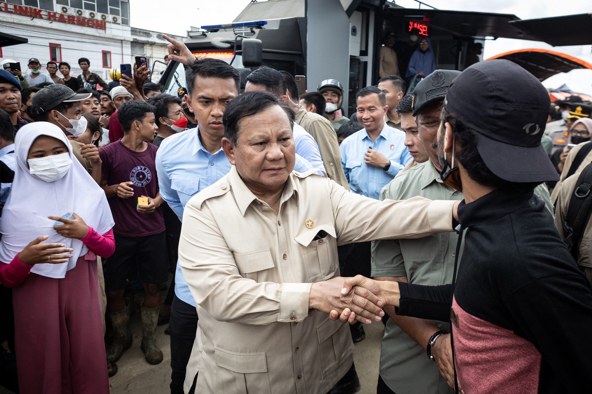インドネシア国家災害対策庁によると、11月末に西部スマトラ島を襲った豪雨による死者が13日、1006人となった。写真は12日、スマトラ島北部のアチェ州の避難所で被災者を見舞うプラボウォ大統領(中央)。【AFP時事】