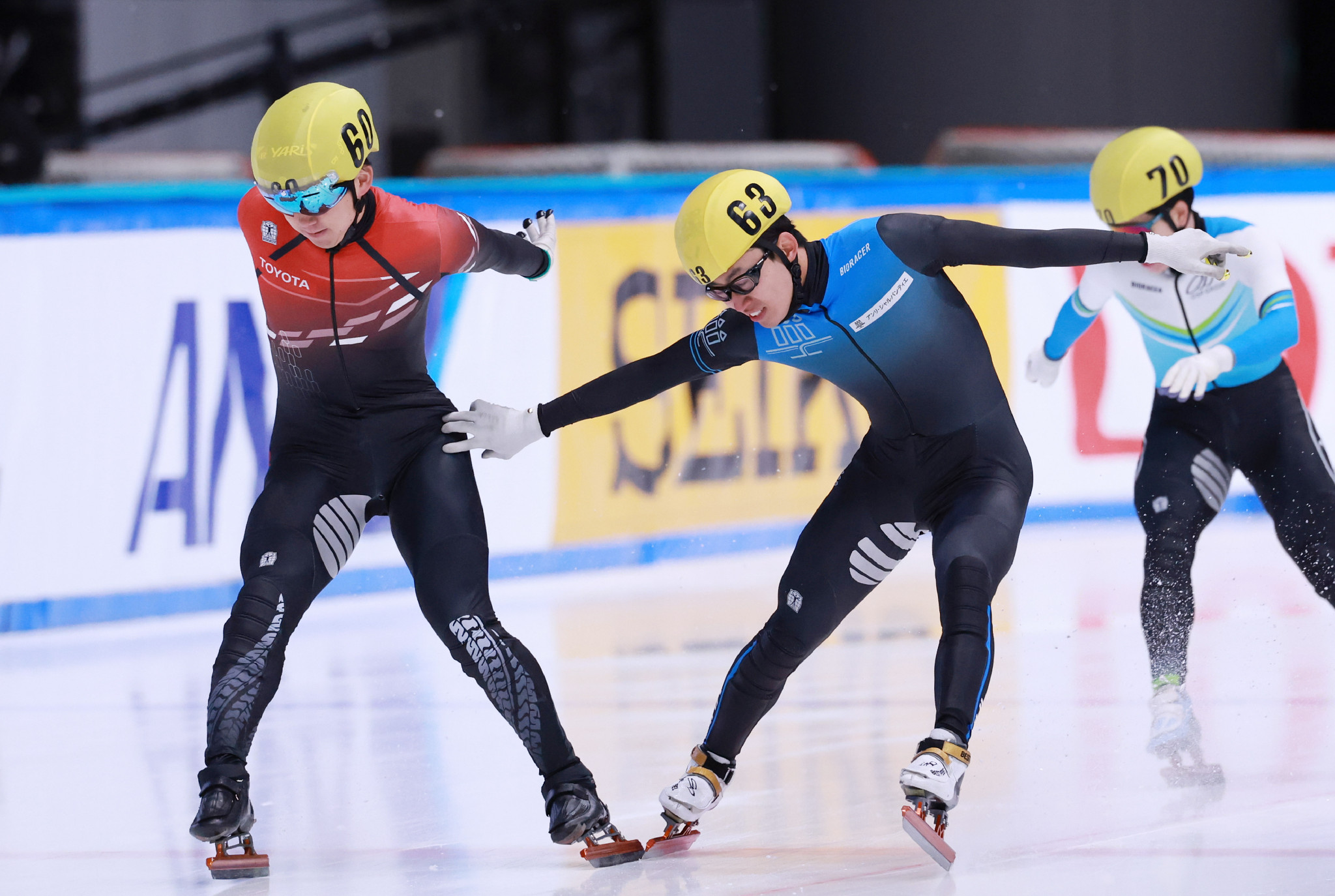 全日本ショートトラック。男子1500メートル決勝再レースでゴールする松林佑倭(手前右)=13日、東京・辰巳アイスアリーナ