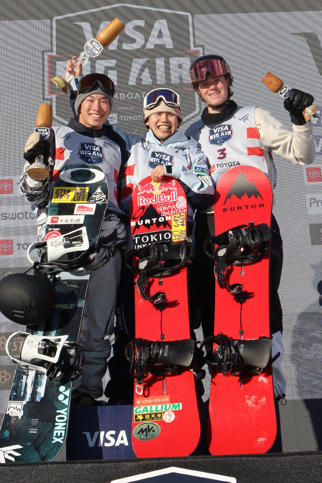 スノーボードのワールドカップ(W杯)は13日、米コロラド州スティームボートスプリングズでビッグエア今季最終第3戦の決勝が行われ、男子は荻原大翔(中央)が今季初優勝を果たした。左は2位の木村葵来。