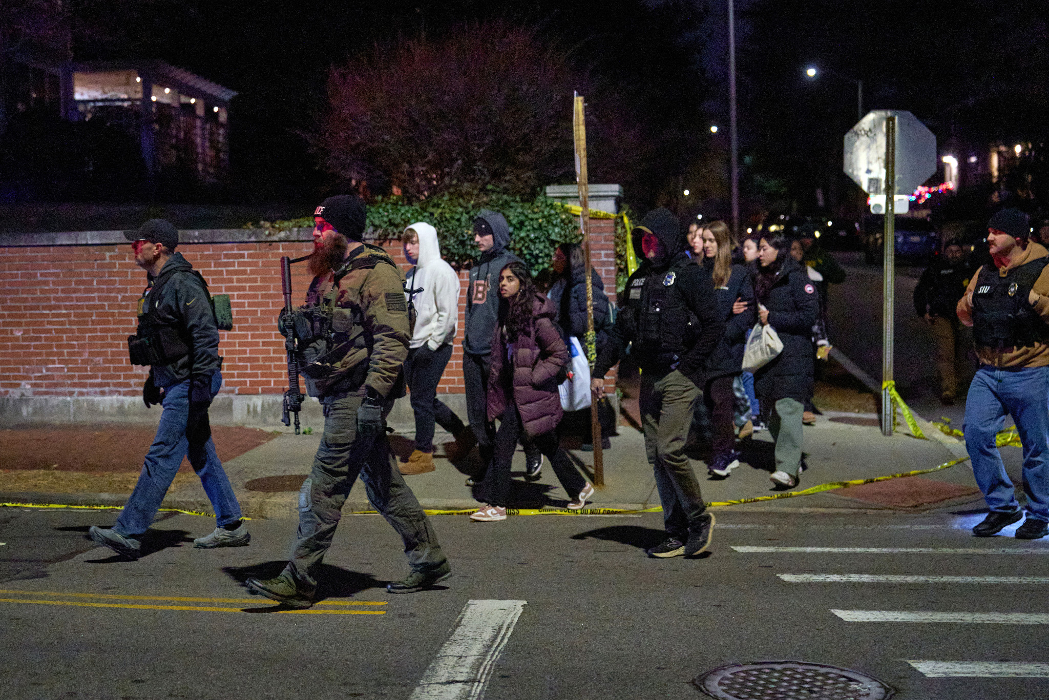 13日、銃撃事件があった米東部ロードアイランド州プロビデンスのブラウン大学で、警官に護衛されながら移動する学生ら。