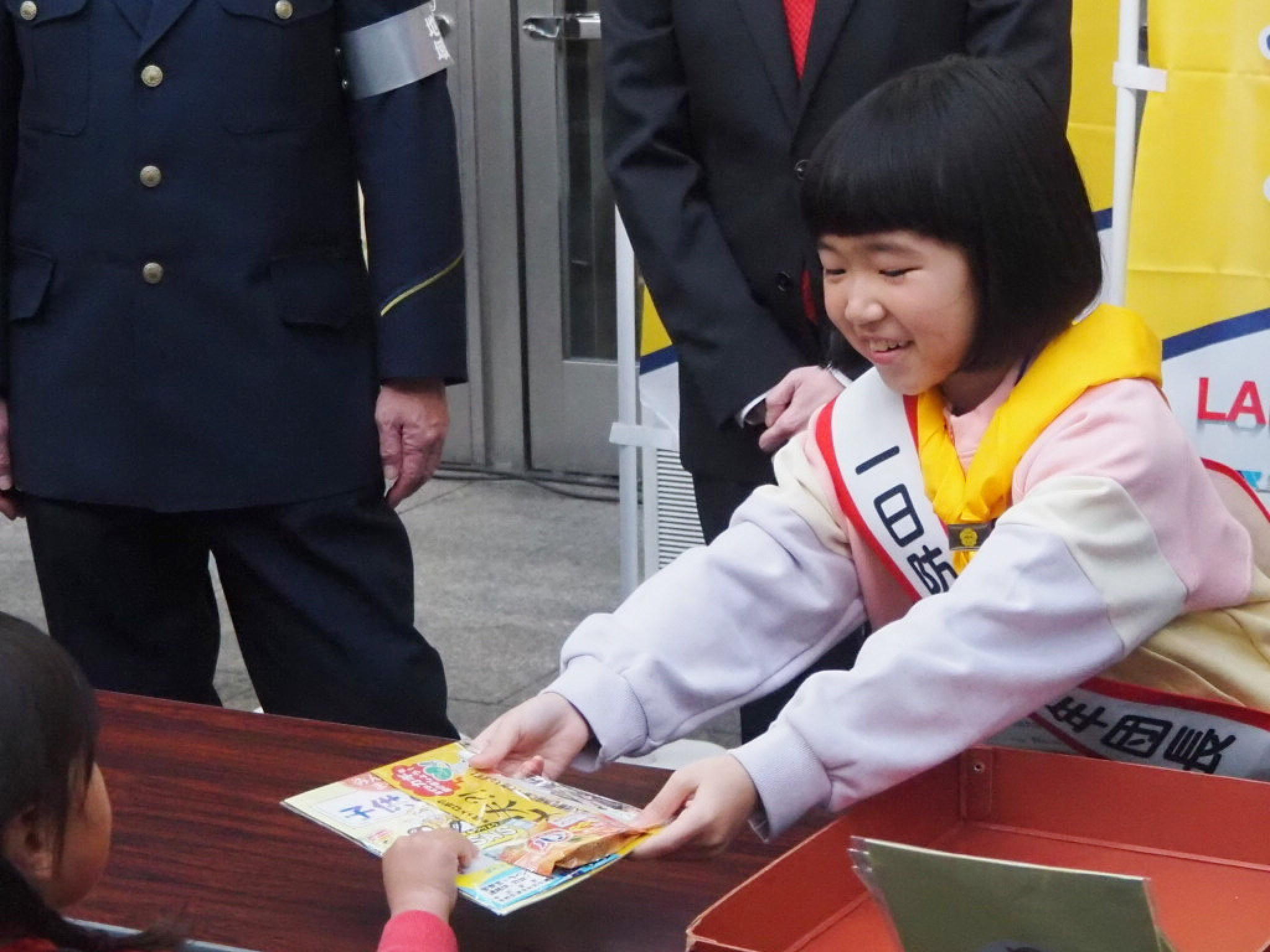 愛知県警は14日、一日防犯少年団長に俳優の永尾柚乃さんを任命し、JR名古屋駅で子どもの防犯対策を呼び掛けた。永尾さんは連れ去り防止の合い言葉を学び「友達にも教えたい」と話した=名古屋市中村区