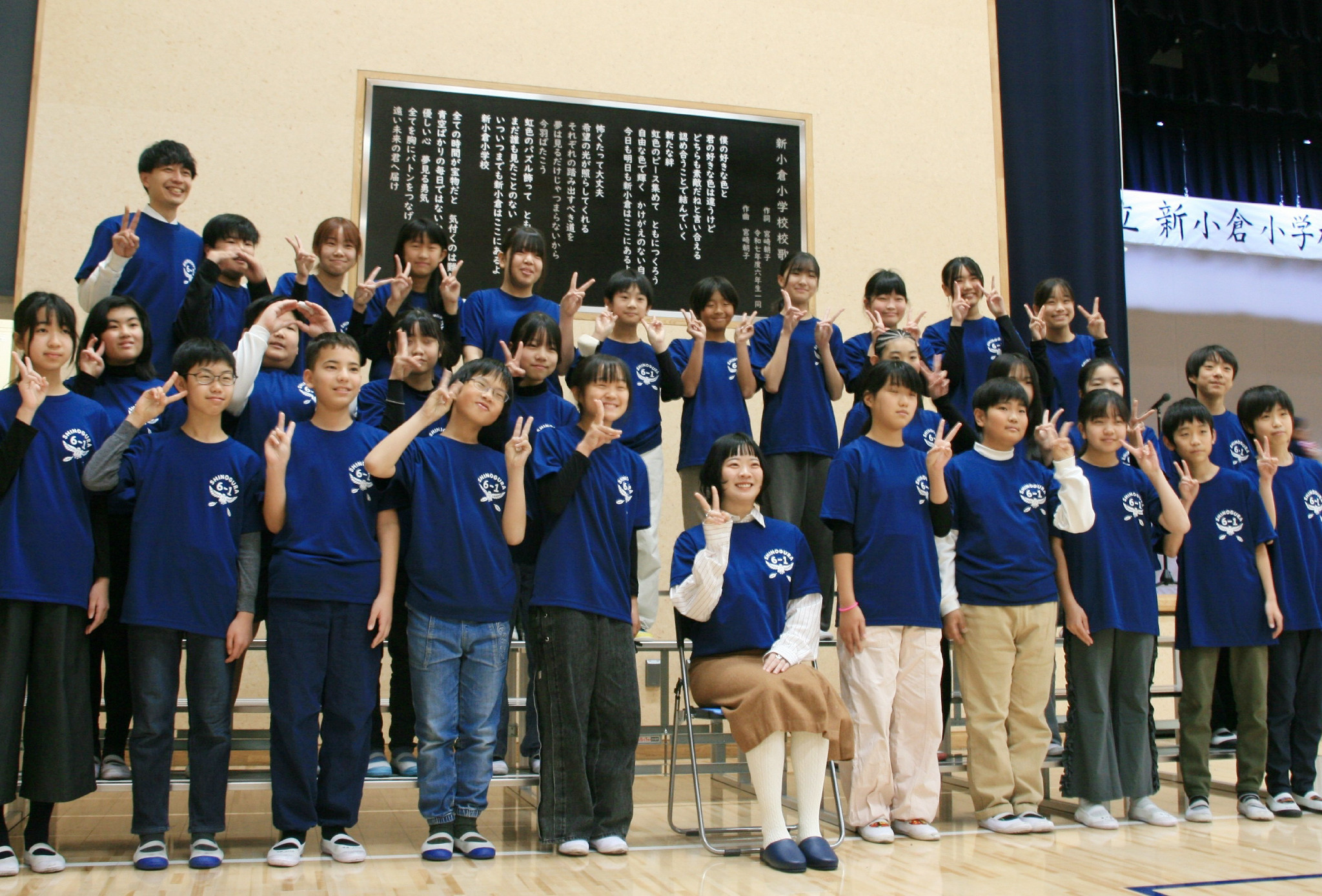 今年4月に開校した川崎市立新小倉小学校(川崎市幸区)で開校記念式典が行われ、同市出身のロックバンド「SHISHAMO」のメンバー、宮崎朝子さん(前列中央)制作の校歌が児童により初めて披露された=13日