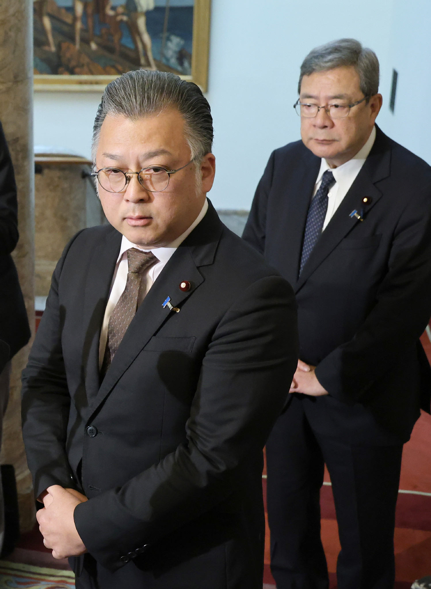 衆院政治改革特別委員会が休憩となり、記者団の取材に応じる日本維新の会の浦野靖人選対委員長代行(左)。右は中司宏幹事長=15日午後、国会内