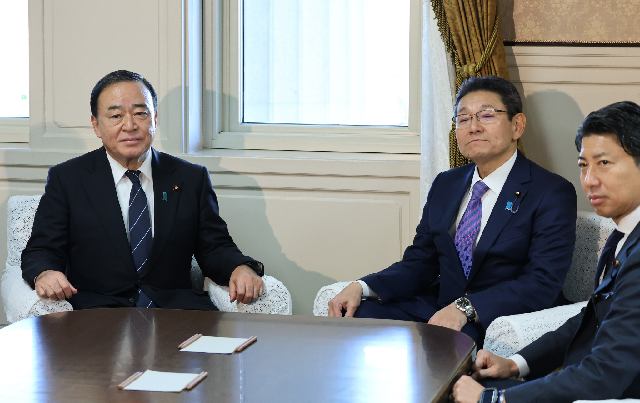 衆院政治改革特別委員会で日本維新の会から採決を求める動議が提出されたことを受け、会談に臨む立憲民主党の笠浩史国対委員長(中央)と自民党の梶山弘志国対委員長(左)=15日午後、国会内