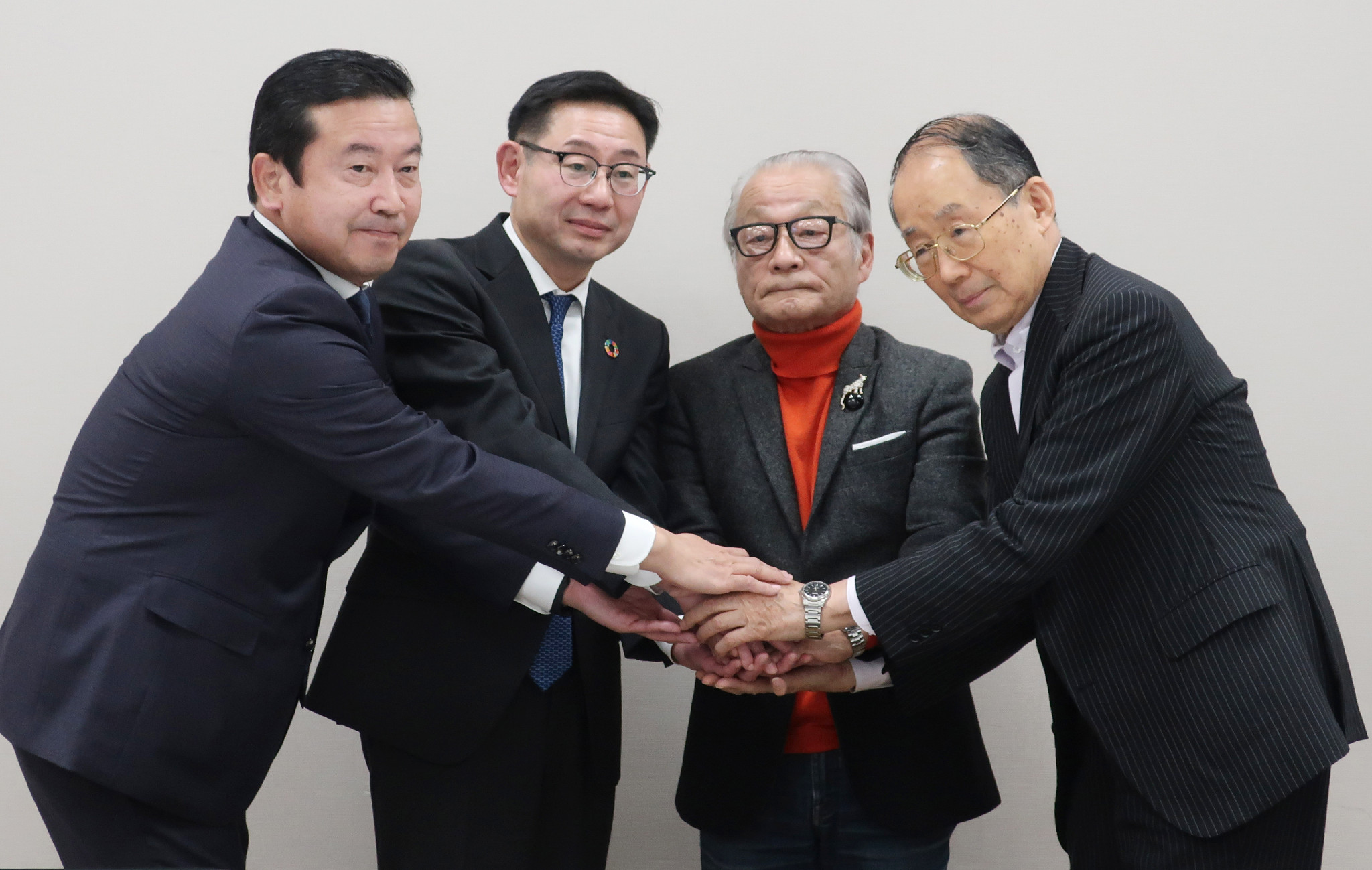 共同記者会見後に撮影に応じるスルガ銀行の加藤広亮社長(中央左)と河合弘之弁護士(同右)ら=15日午後、東京都中央区