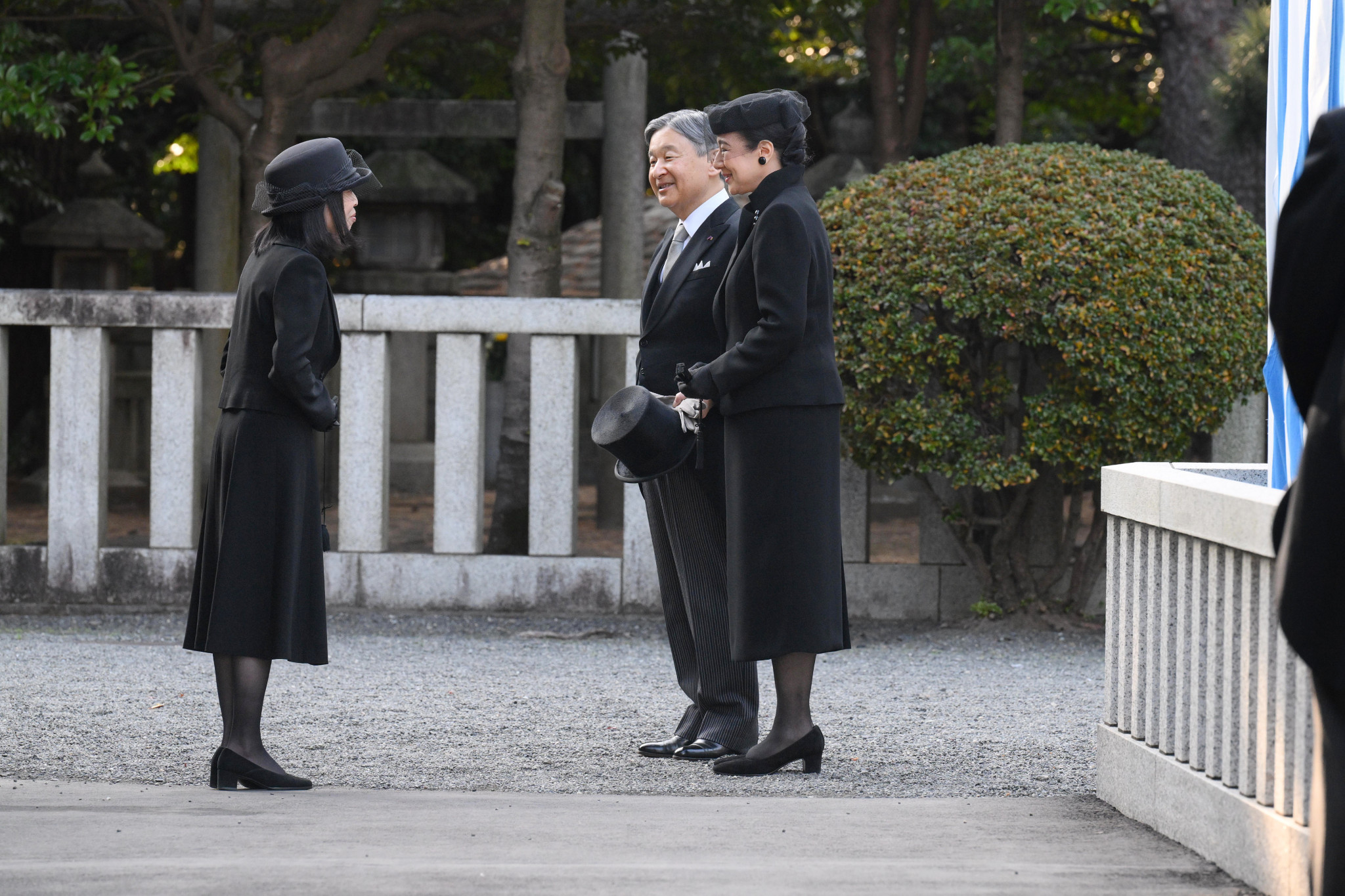 三笠宮妃百合子さまの墓への参拝を終え、三笠宮家の彬子さまと言葉を交わされる天皇、皇后両陛下=17日午後、東京都文京区の豊島岡墓地(代表撮影)
