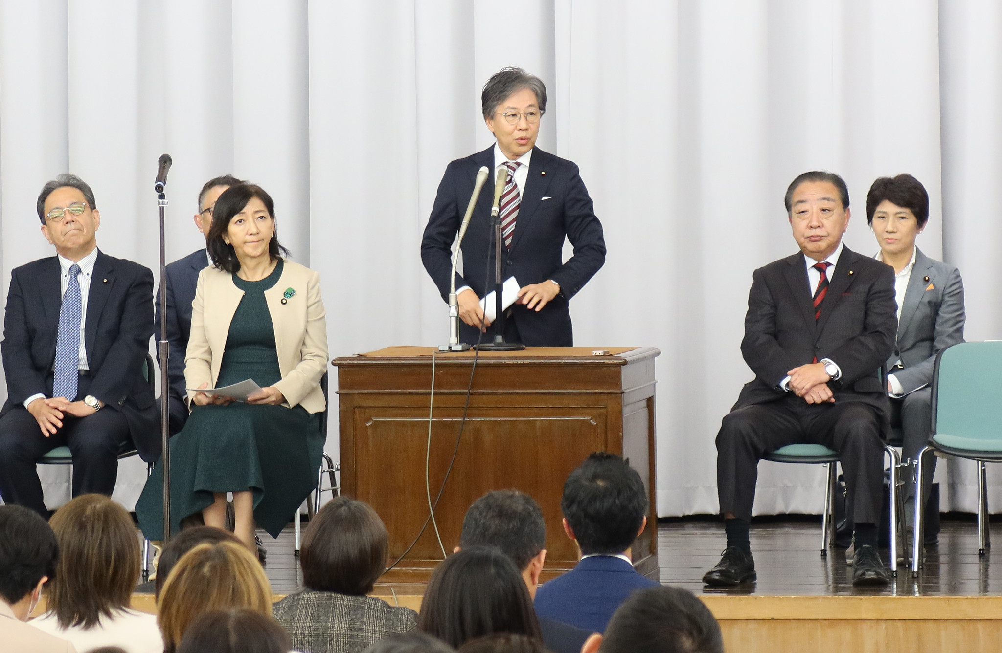 立憲民主党の両院議員総会であいさつする安住淳幹事長(中央)=17日午後、国会内
