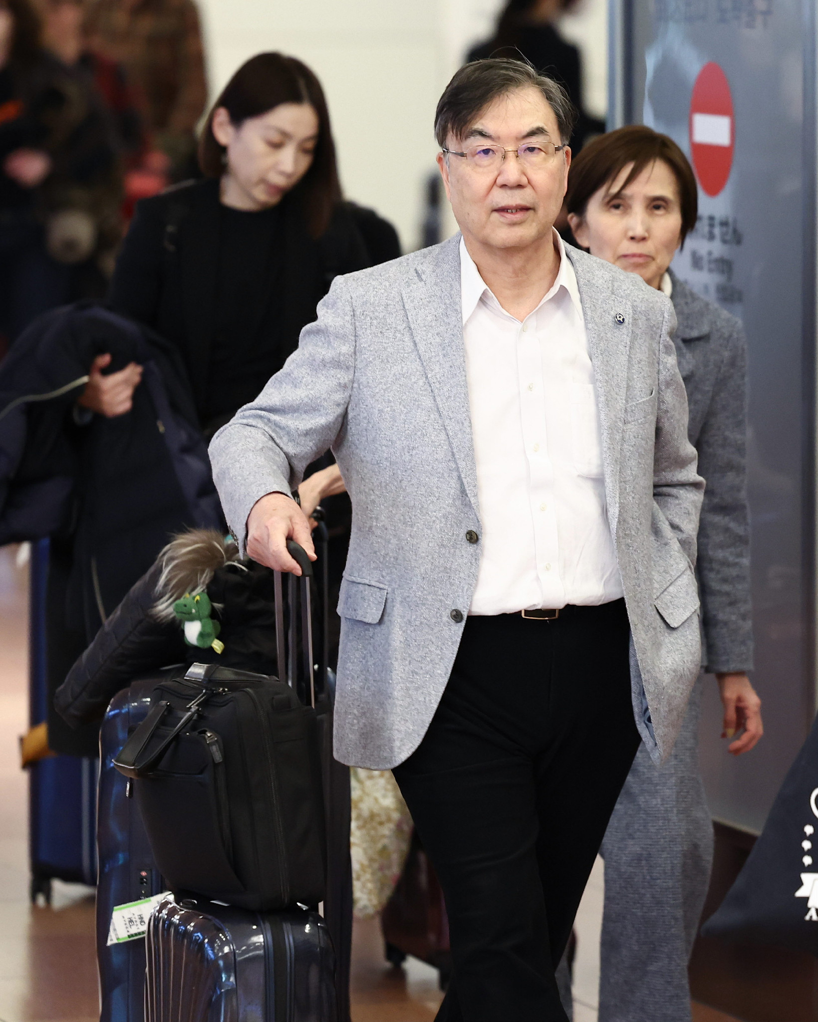 ノーベル賞授賞式を終え、帰国した大阪大の坂口志文特任教授(手前)=17日午後、羽田空港