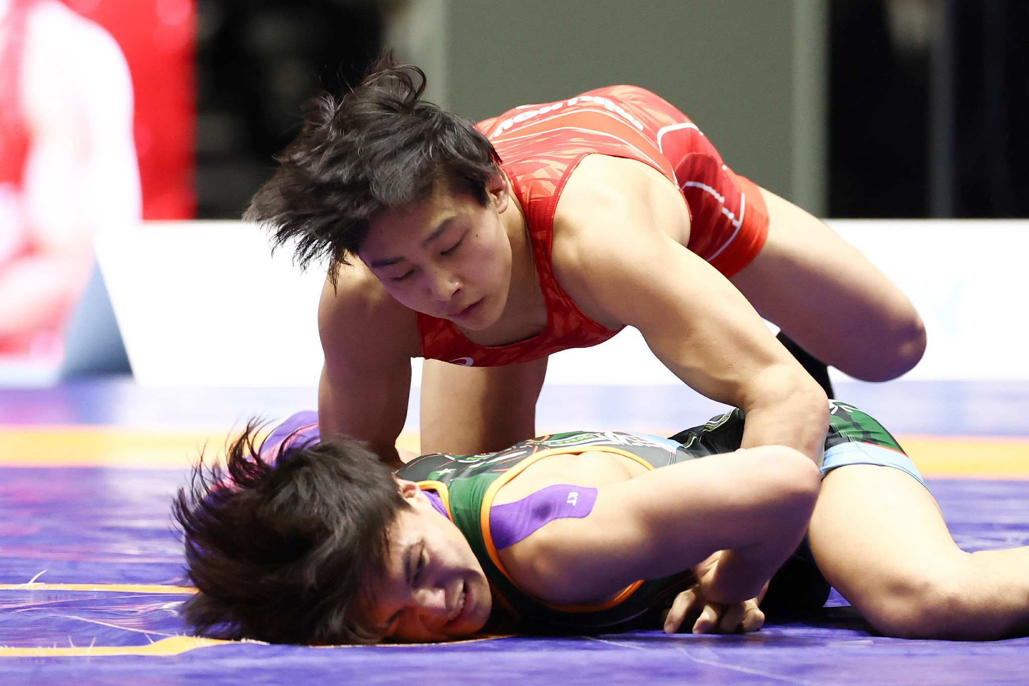 全日本レスリング。男子グレコローマンスタイル63キロ級決勝、小柴亮太(下)からポイントを奪う田南部魁星=18日、東京・駒沢体育館