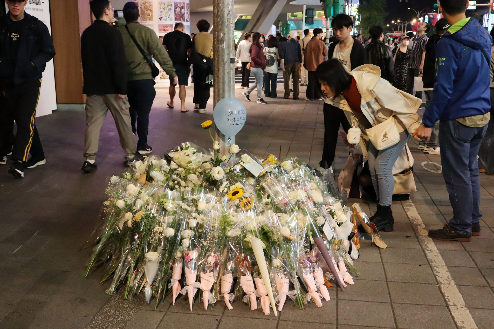 20日、台湾・台北市で、襲撃現場となった商業ビルの前に手向けられた花束。