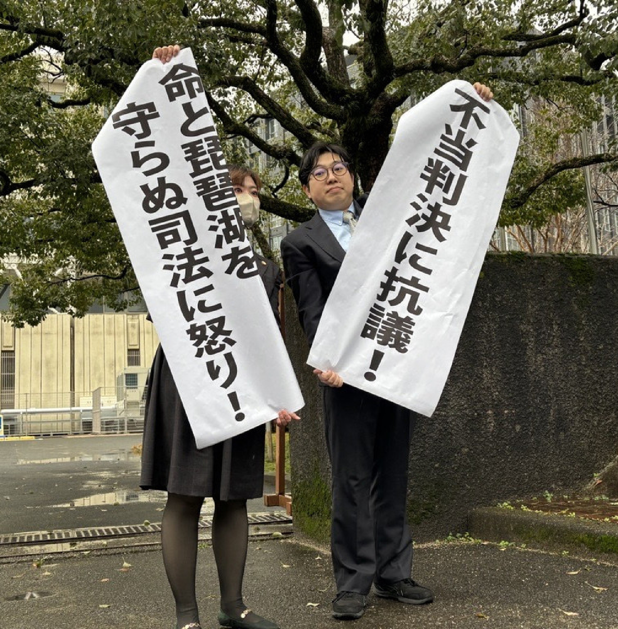 原発差し止め訴訟判決後、「不当判決」などと書かれた紙を掲げる原告側代理人の弁護士ら=25日午後、大津市