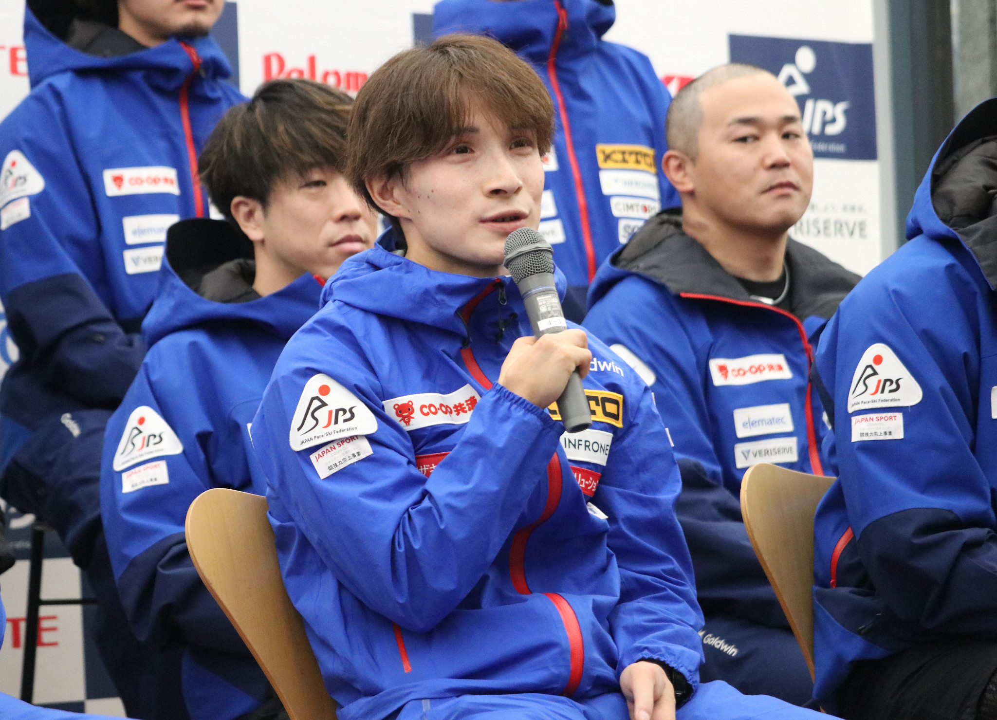 ミラノ・コルティナ冬季パラリンピックに向けた記者会見で、抱負を語るノルディックスキー男子の川除大輝(中央)=25日、東京都内