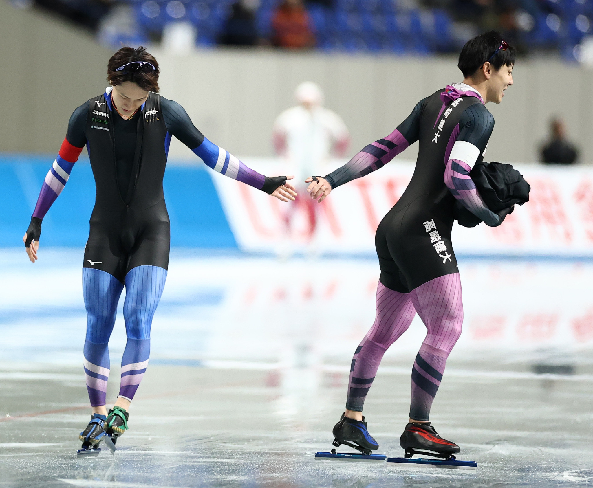 スピードスケートの全日本選手権。男子500メートルのレースを終え、健闘をたたえ合う森重航(左)と新濱立也=26日、長野・エムウェーブ