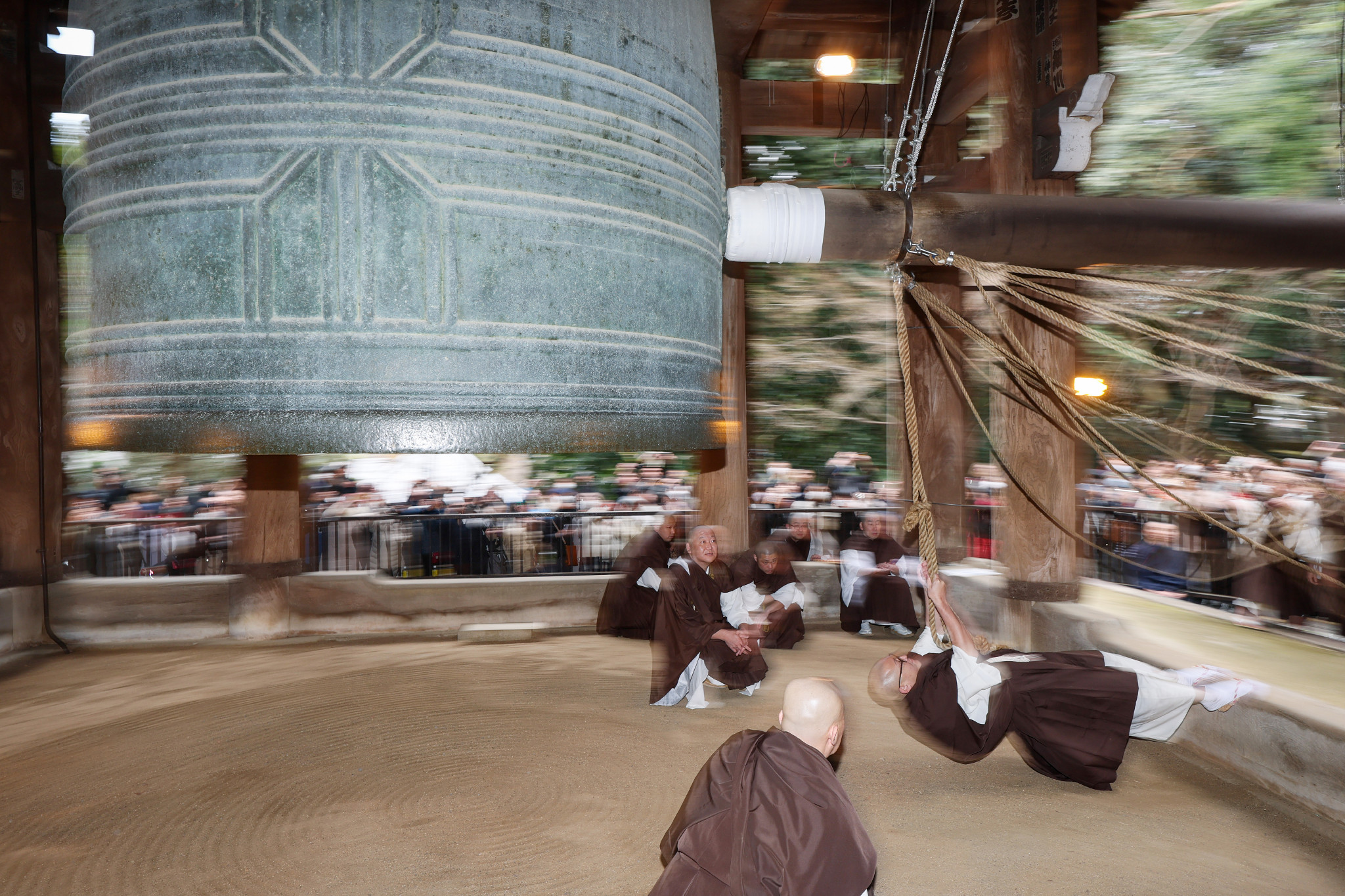 京都市東山区の知恩院で27日、除夜の鐘の試し突きが行われた。17人の僧侶が「えーいひとーつ、そーれ」の掛け声に合わせて鐘を打つと、「ゴーン」と重厚な音が年の瀬の古都に響き渡った。