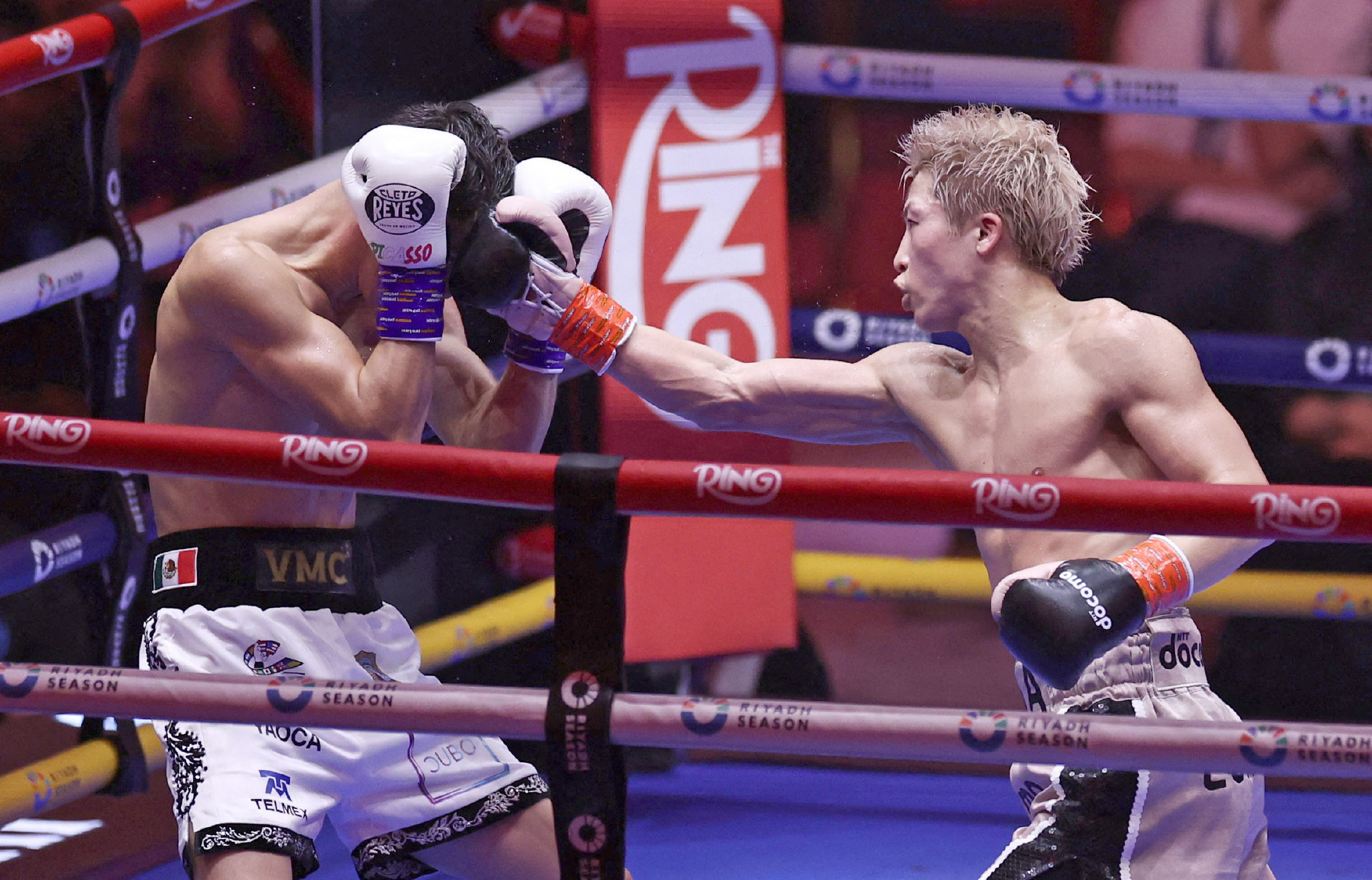 スーパーバンタム級世界主要4団体タイトル戦、パンチを繰り出す井上尚弥(右)=27日、リヤド