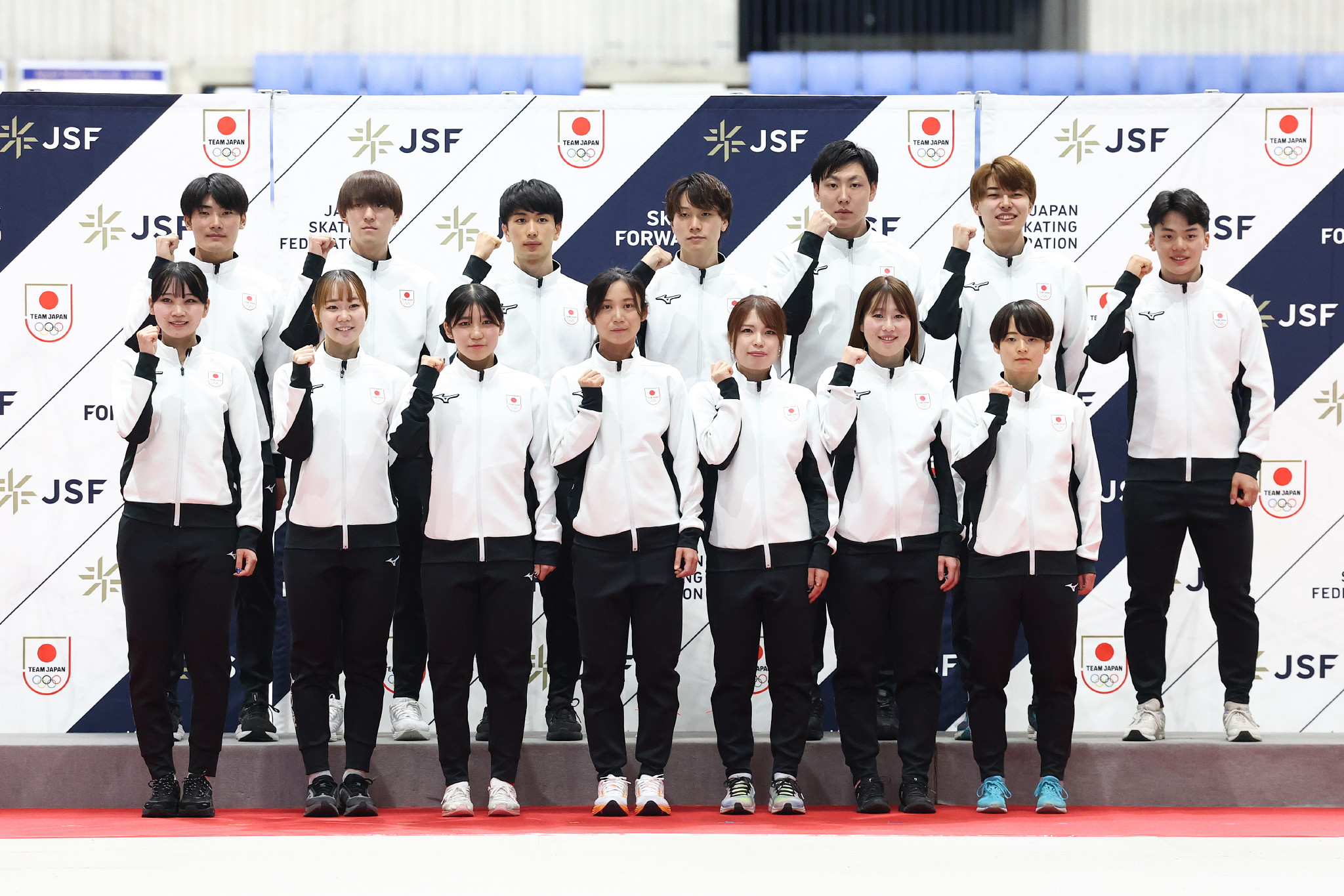 日本スケート連盟は28日、来年2月のミラノ・コルティナ五輪スピードスケート代表の男女各7人を発表した。女子の高木美帆(前列中央)は3大会連続4度目の代表入り=長野・エムウェーブ