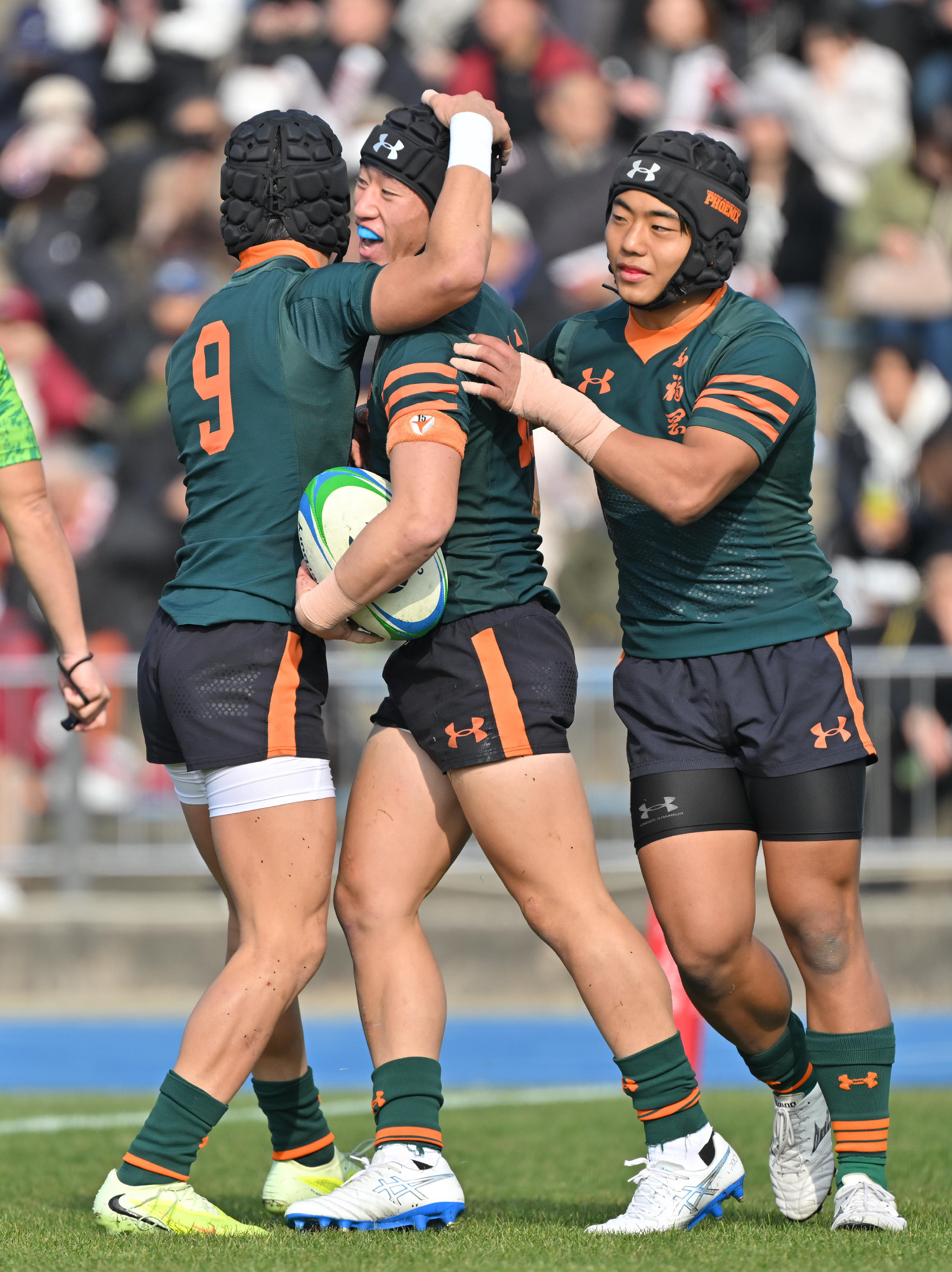 東福岡―早稲田実。前半、先制のトライを決め、喜ぶ東福岡の早坂(中央)=30日、大阪・花園ラグビー場