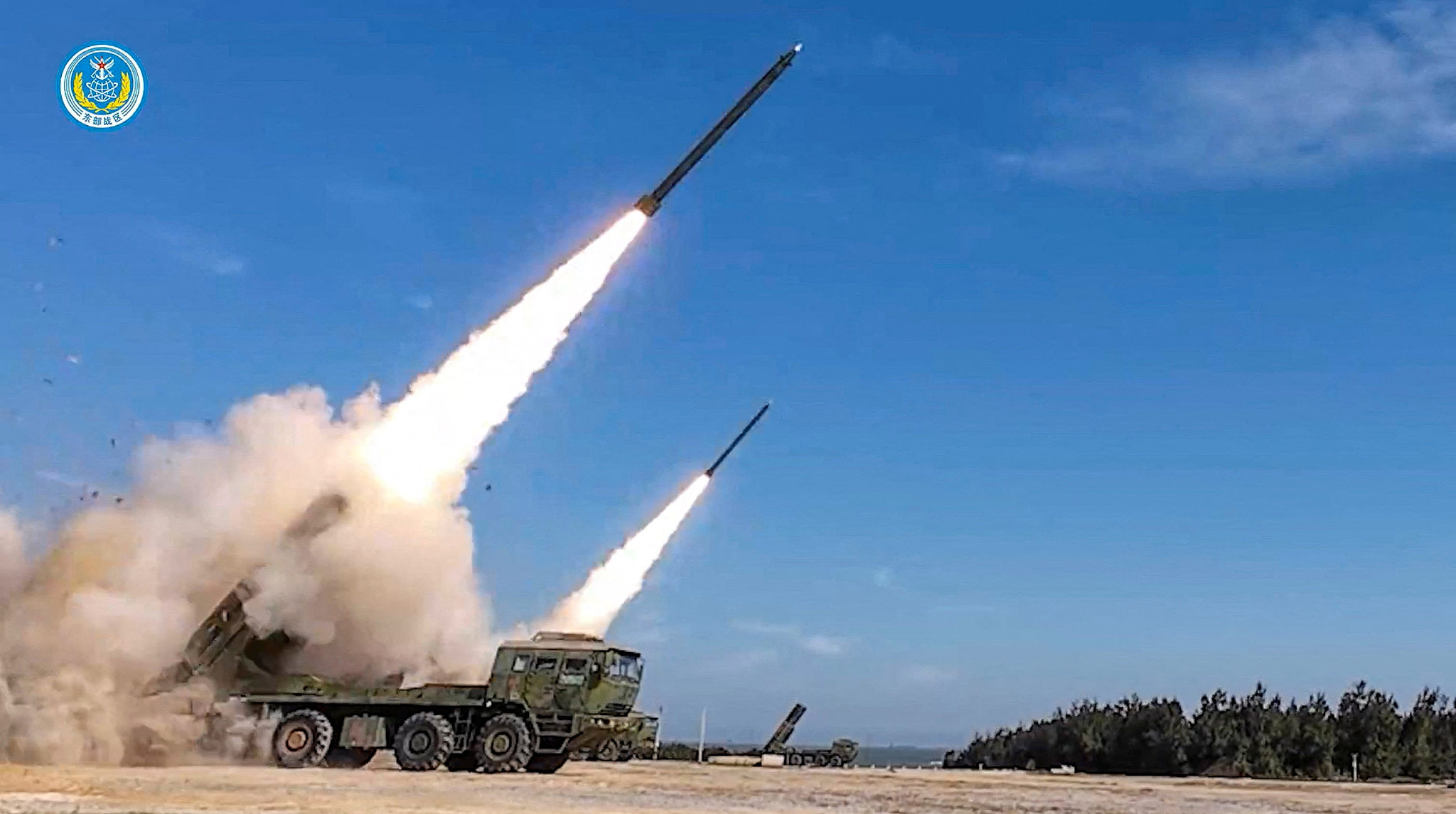 中国軍は30日、台湾を包囲した軍事演習を続けた。写真は中国軍が台湾南部の海域に向けて行った実弾射撃訓練=撮影場所不明(中国軍東部戦区が同日公開した映像より)【ロイター時事】